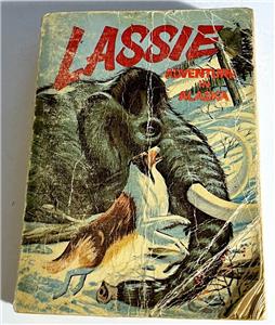 Here's a Whitman Big Little Book soft cover titled Lassie - Adventure in Alaska. Published in 1967 with 249 pages with illustrations. Written by George Elrick. Cover has much wear, pages in great shape. Former owner wrote in page numbers