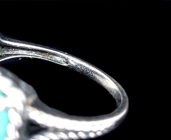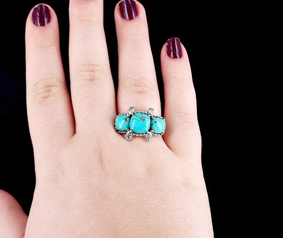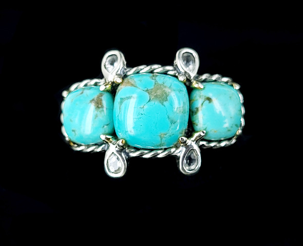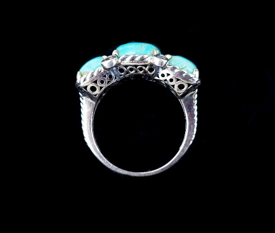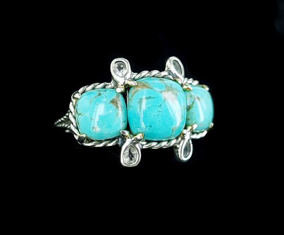 Item offered is an estate sterling turquoise ring. This ring consists of 3 royston turquoise stones set in a pretty sterling setting. There are 4 topaz stones between the turquoise stones. The shank is marked 925 and a flower.