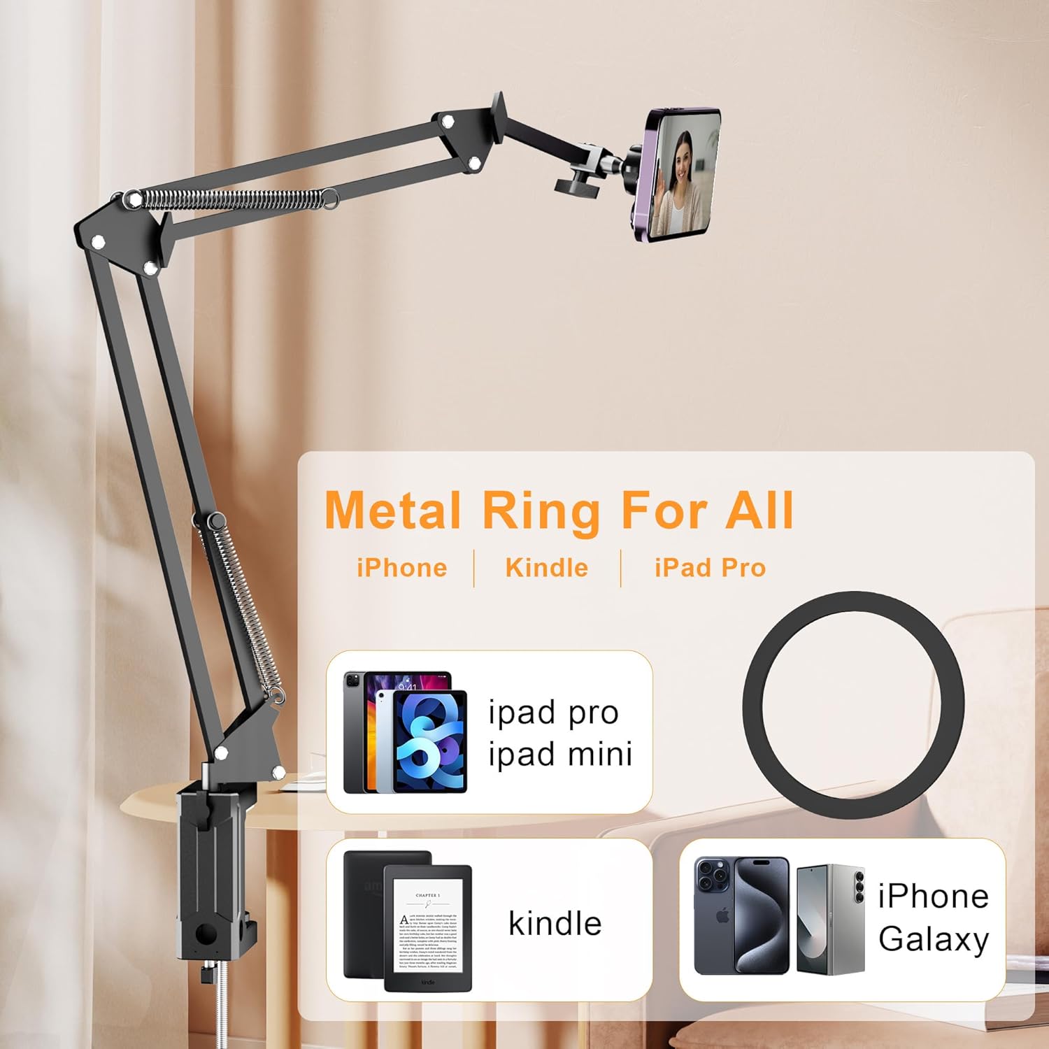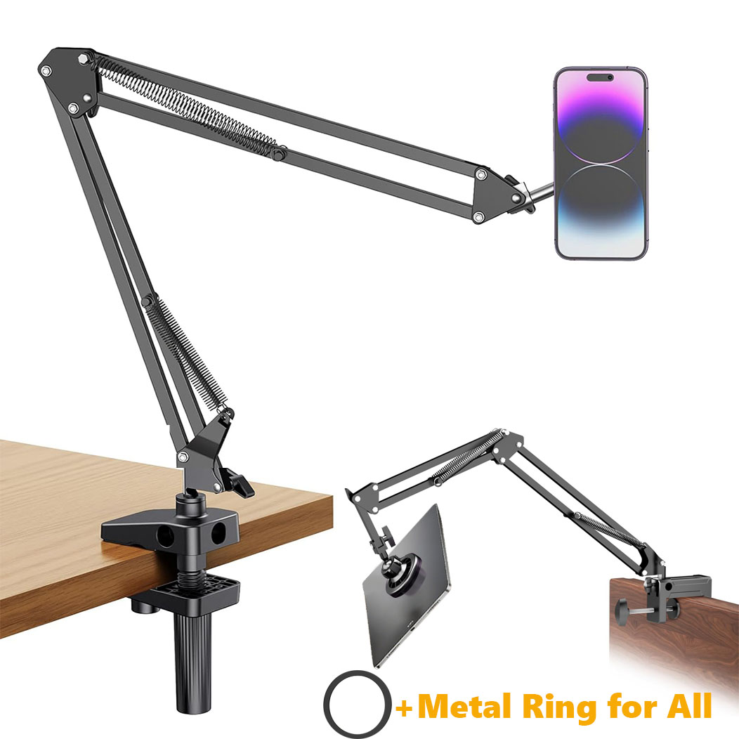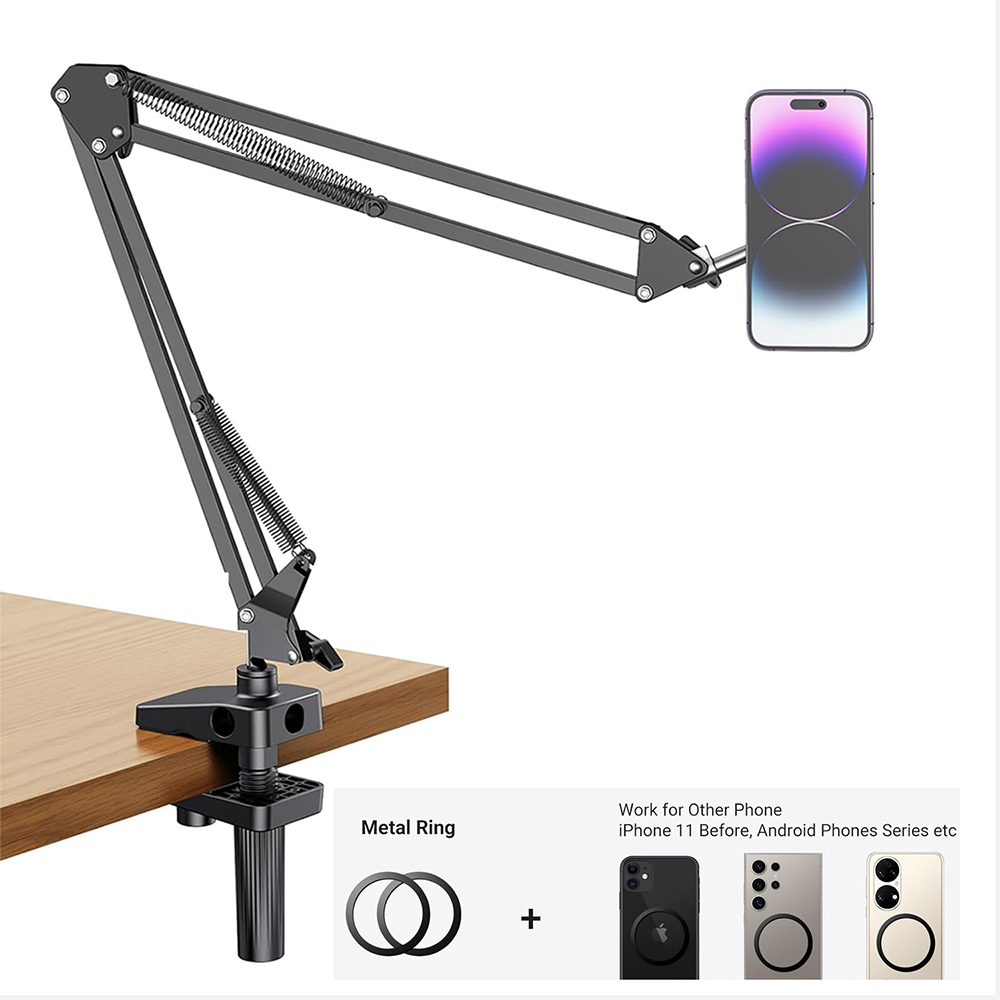 - [ Metal ring for all devices ] This phone stand for recording is compatible with iPhone 12/13/14/15/16 or phones with magsafe case. For non magnetic devices like Samsung phones, older iphones, Kindle, iPad, you can stick the metal ring on it, then you can snap your device to the holder quickly.