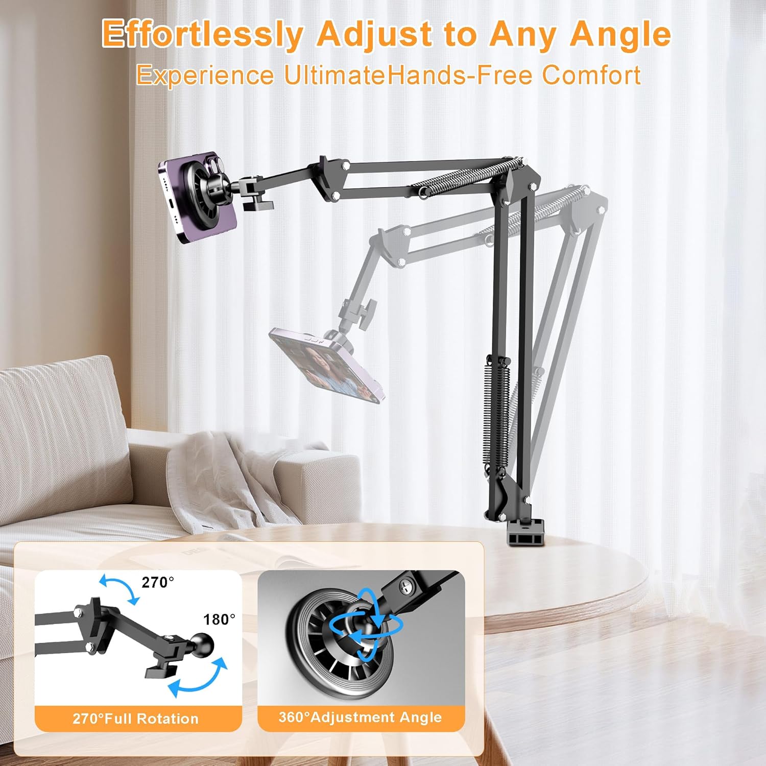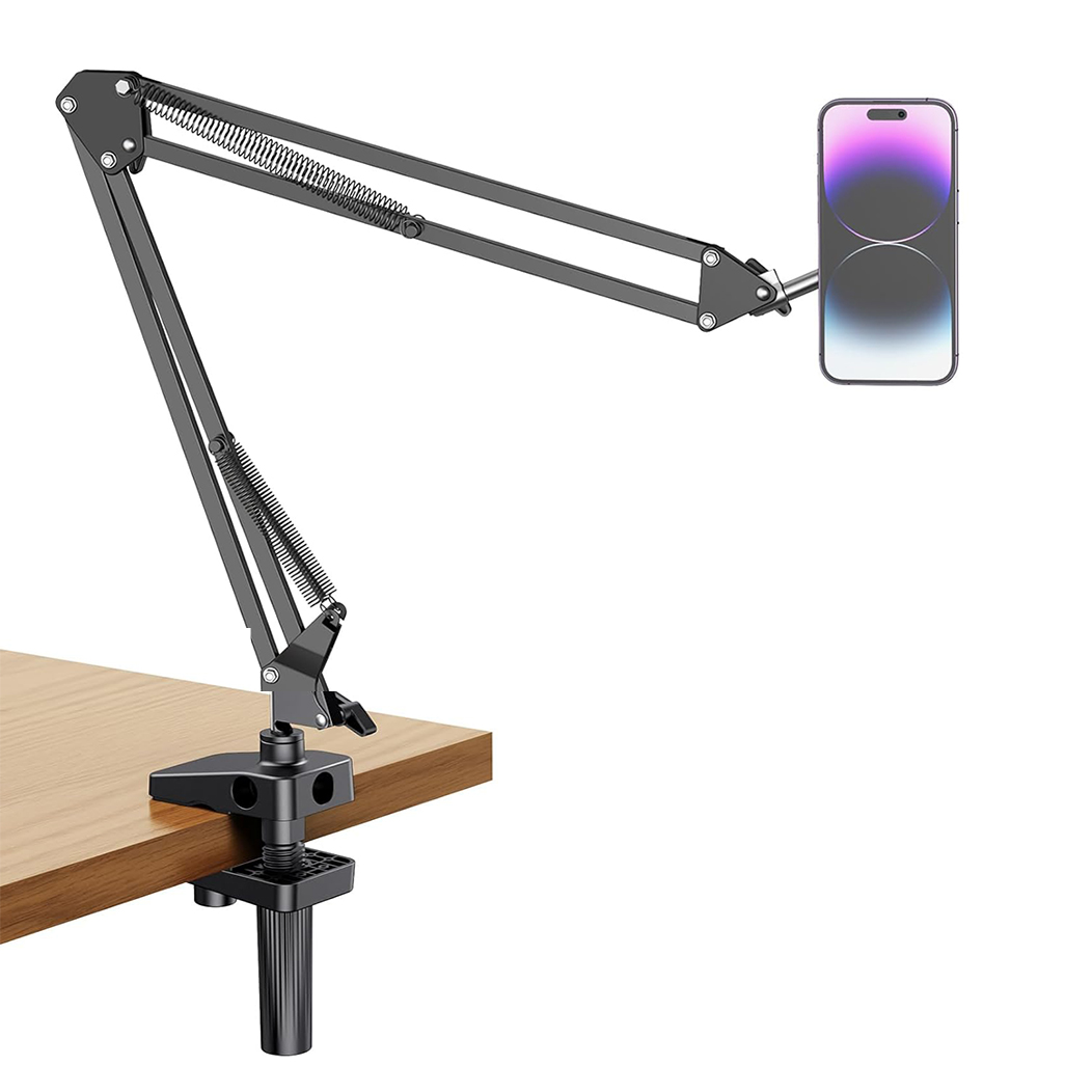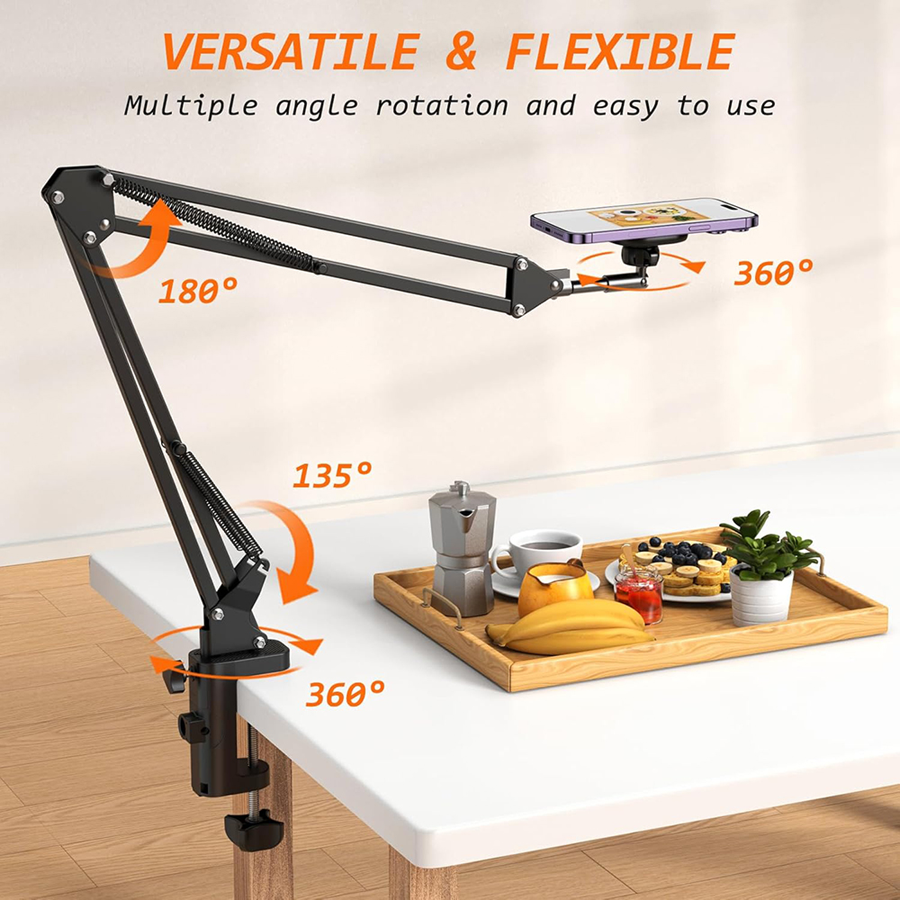 - [ Easy to Adjust ] Compared to other gooseneck design, our phone arm use spring support which is easily to adjust the angle and position with one hand, perfect for your laying down reading while eating snacks, perfect for you video calls, live streaming, watch movies. Easy to move around, adjustable, flexible, rotatable