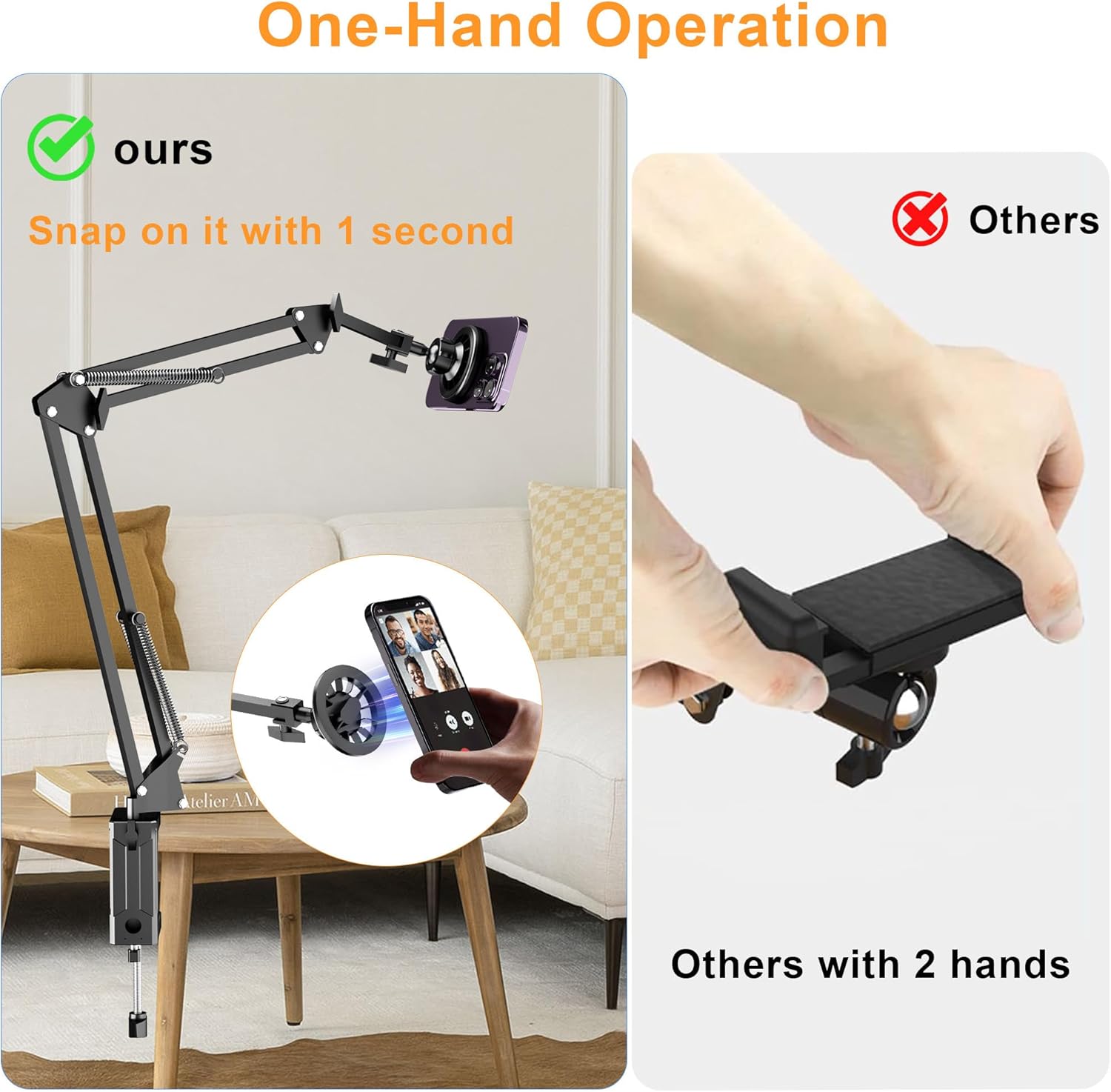 - [ 1s Snap onto ] This gooseneck phone holder has magnetic feature, compared to other phone holder with clip, this design is more convenient, you can snap your phone onto it with one-hand operation. The built in magnet is very strong which it can attract your device firmly.