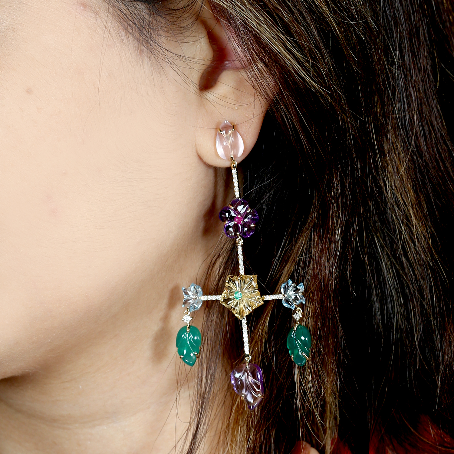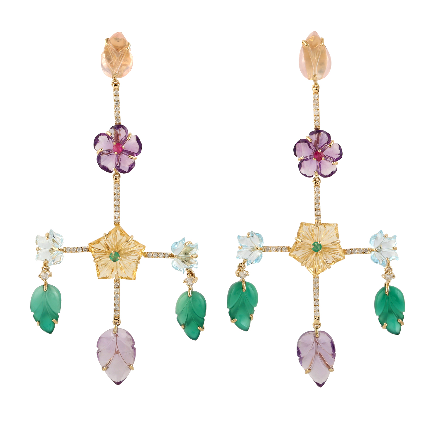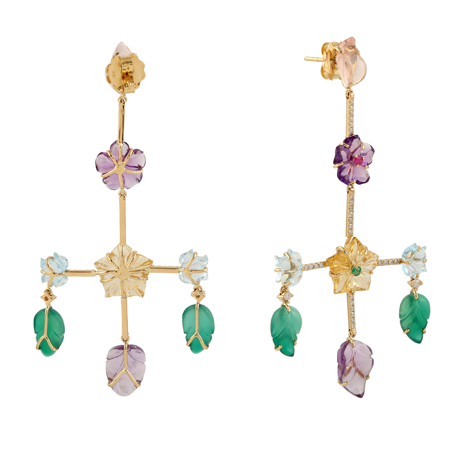 Floral Carved Multi Jemstone Chandelier Earring In 18k Gold