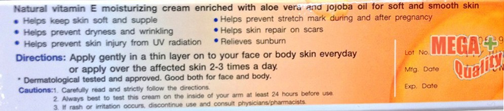 Decription : Vitara-E Natural Moisturizing Cream-Vitamin E cream Vitara-E Natural Moisturizing Cream Enriched with Aloe Vera & Jojoba Oil Developed for Soft & Smooth Skin. Dermatological tested and approved. Good both for face and body. Vitara-E will make your skin healthy looking, ameliorate or eliminate wrinkles, help skin repair on scars, prevent stretch-marks during and after pregnancy, prevent skin injury from UV irradiation, keep your skin soft and always youthful looking. Vitara-E Vitamin E cream with natural ingredients Vitamin E-will reduce free radicals which lead to aging, and vitamin E is an excellent antioxidant. Jojoba Oil- is an emollient and effective moisturizer that makes your skin soft and smoothness. Aloe Vera-will relieve symptom of skin injury from UV irradiation and help skin repair.