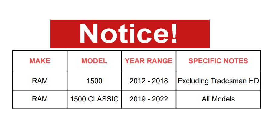 | RAM | 1500 | 2012 - 2018 | Excluding Tradesman HD |