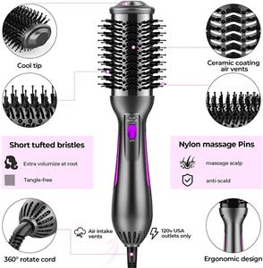 - Professional Design for Blow Dry Our blow dry brush is built with Nylon Pin & Tufted Bristles to prevent hair from tangling and makes your hair more smoother and fluffier after drying. Ergonomic handle reduce hand fatigue during hair drying. 4.4*2.5*1.5 inch brush barrel adopts ceramic coating to help reduce damage during styling. 360° airflow vents distribute the heat evenly, dry the hair quickly and dry from the inside out.