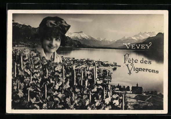 AK Vevey, Fete de Vignerons - Junge Frau zwischen Weinstöcken vor Ort, See und Bergen