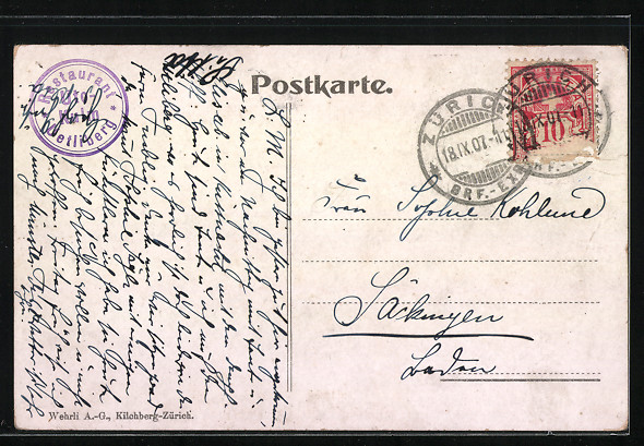 gelaufen 1907, Briefmarke tw. entfernt, rückseitig Oberflächenschaden, Stempelspur, guter Zustand