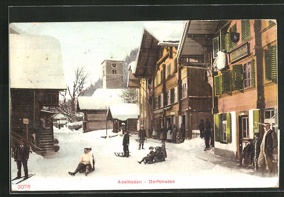 AK Adelboden, Rodler mit Schlitten in der Dorfstraße