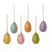 * Set of six easter egg ornaments and hanging tree stand * Gold marble pattern on easter eggs with hanging loop * Blossom style tree with a solid wood base * Tree measures 26.5" height * Eggs measure 2" width * Eggs crafted from handmade paper * Made in Bangladesh ---------------------------------Handmade paper is made from several different types of materials like jute, water hyacnith and recycled silk from fabric mills. A fine mixture of natural fibers and silk is made and dried as sheets. These sheets are cut out to make ornaments, greeting cards and lamps. Our products are sourced from a women's cooperative in Bangladesh that specializes in making these silk paper products.