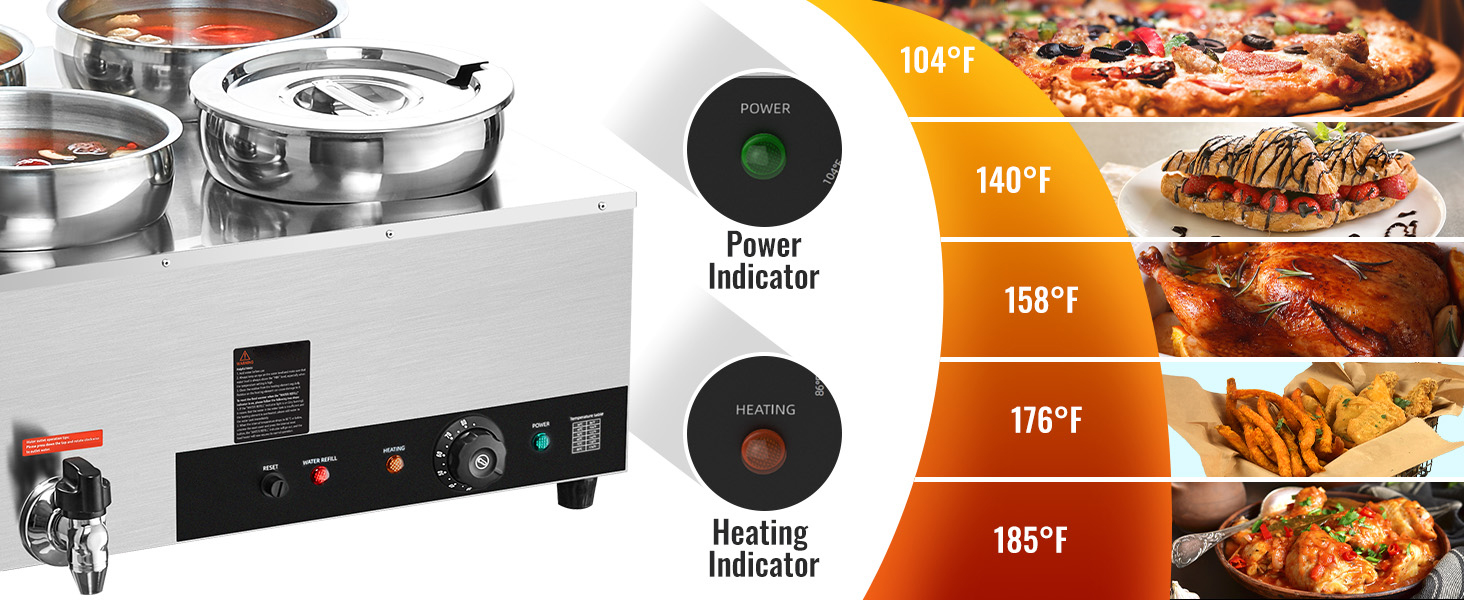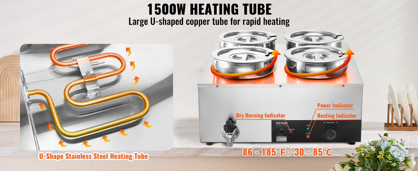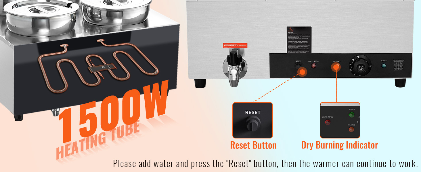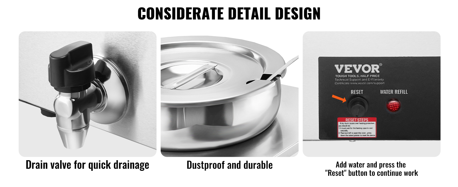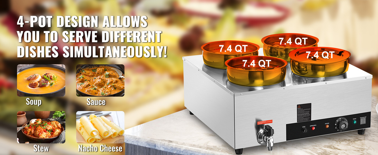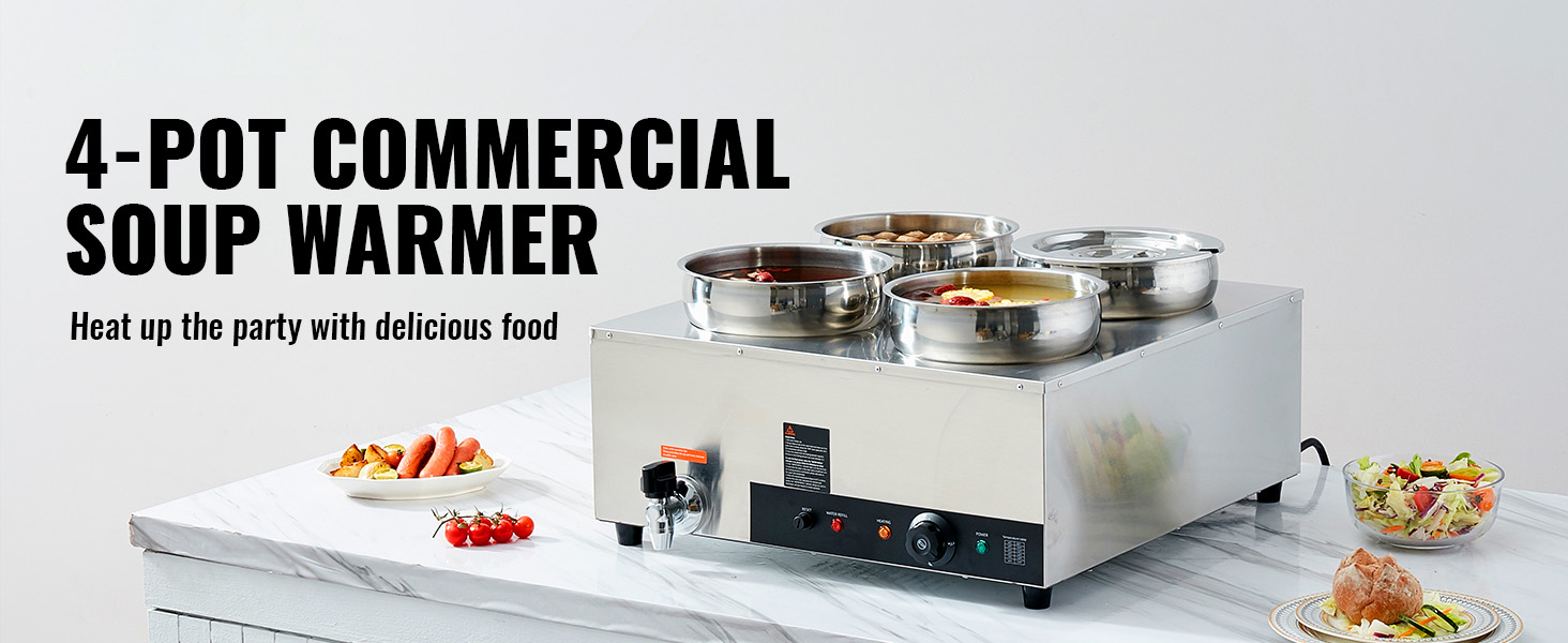 This soup warmer features a powerful 1500-watt motor that rapidly warms up your food to maintain its hot and delicious flavors. You can adjust the temperature output to suit your preference. Ideal for commercial settings such as restaurants, hotels, and parties.