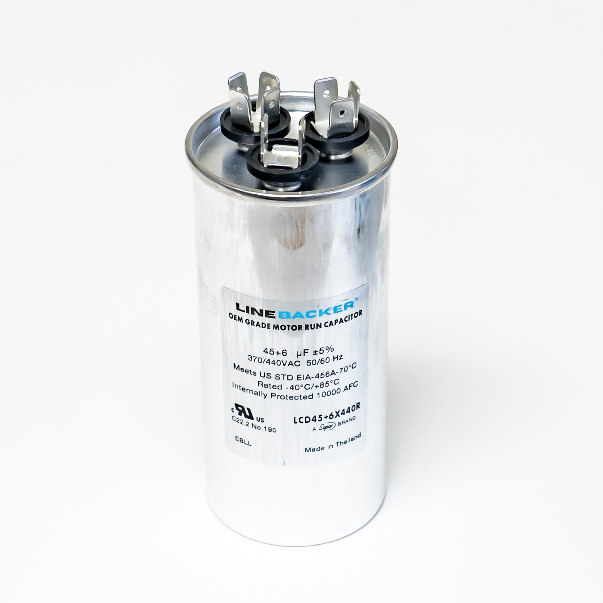 Linebacker Motor Run Capacitors are built for longevity and performance. Engineered by an ISO certified manufacture with over twenty years experience in OEM capacitor fabrication. Linebacker capacitors come off the same production line as the OEM, and are 100% in-line production tested to the same rigorous international standards. Linebacker capacitors are manufactured with thick polypropylene foil to handle increased operating temperatures.