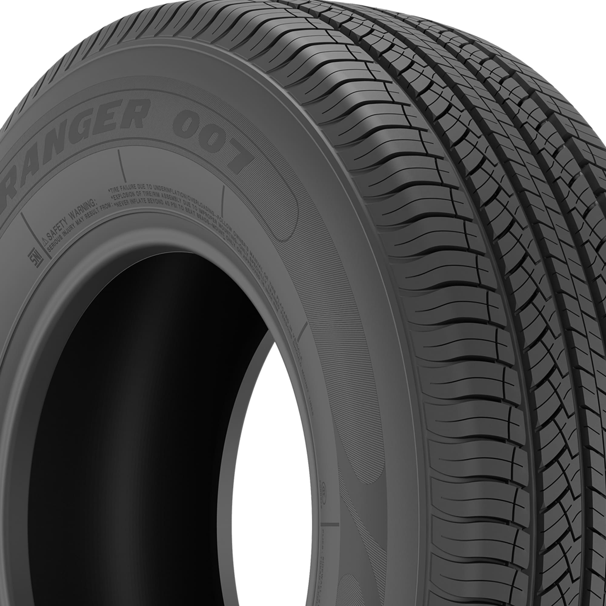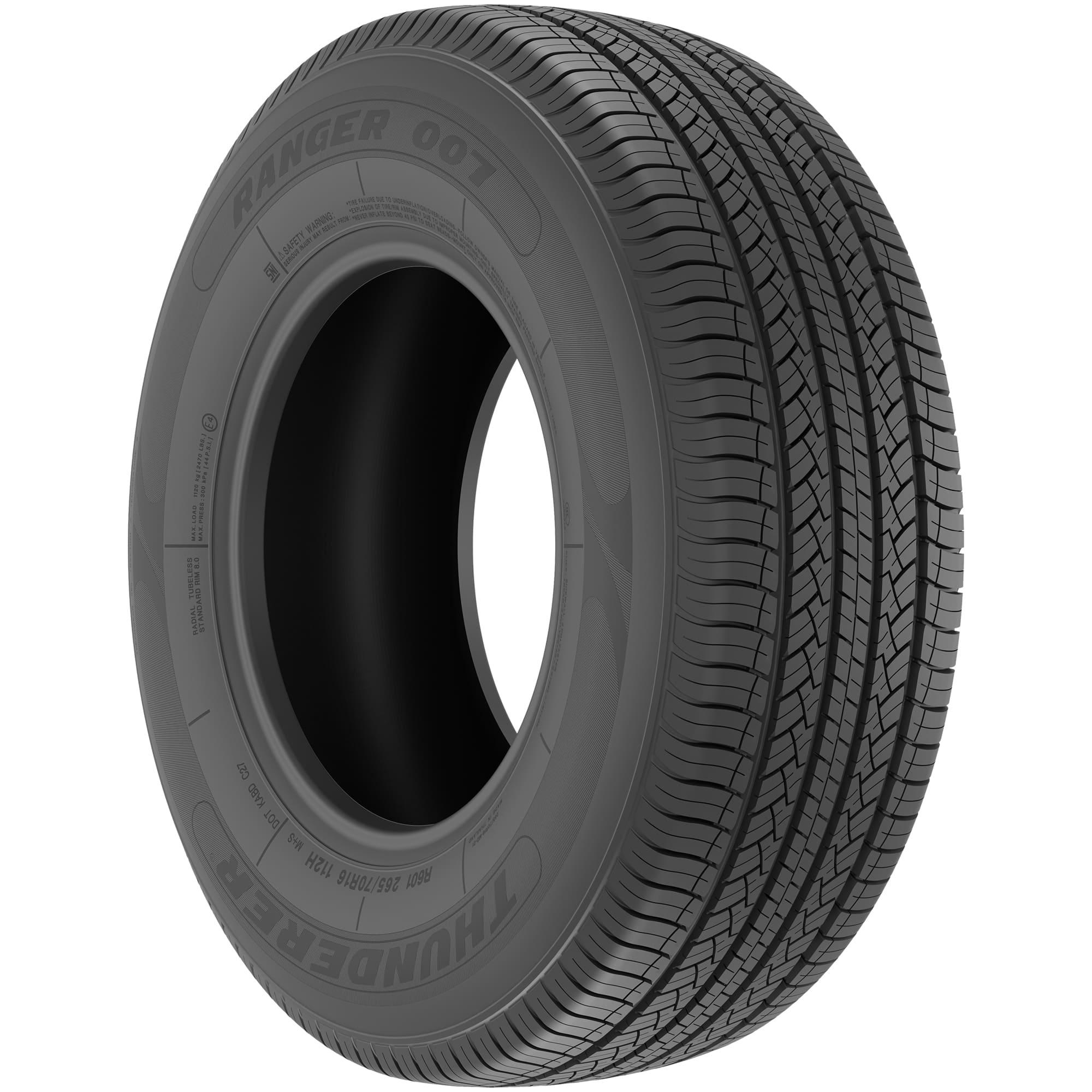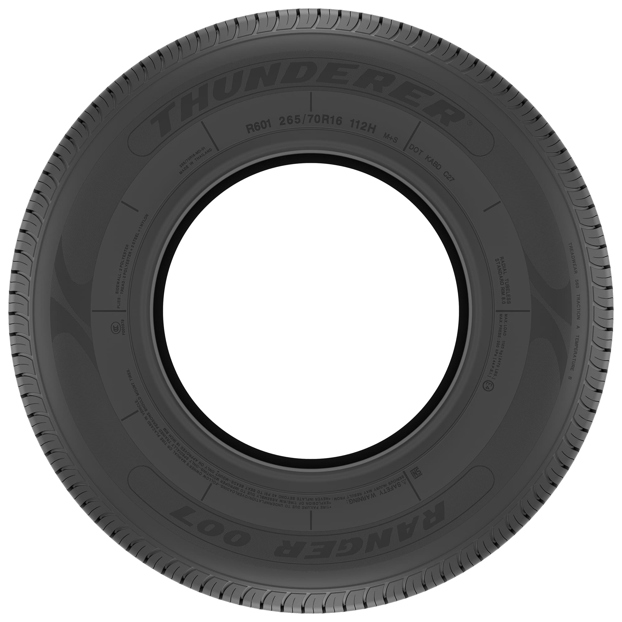 The Thunderer Ranger R007 HT is an all-season tire designed for light trucks and SUVs. It features a 5-rib tread with angled and circumferential grooves to divert water from the contact patch and prevent hydroplaning. Additionally, it has angled grooves and sipes for improved wet and winter traction, a closed shoulder for better cornering and stability, and a long-lasting rubber compound. Plus, the Thunderer Ranger R007 HT comes with a 60,000 mile limited manufacturer tread life warranty.