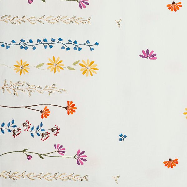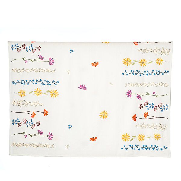 * Hand embroidered tablecloth * Spring floral embroidery * Embroidered using colorful threads * Measures 90" length, and 60" width * Produced at a women's empowerent group * Made in Ahmedabad, India ---------------------------------Mahila Hand Embroidery is a collection of hand embroidered textiles made at St Mary's Mahila Shikshan Kendra at Ahmedabad, Gujarat. The center is known for providing employment to women from the local village Gomtipur. They specialize in hand embroidered textiles using indigenous craftsmanship. St. Mary’s Mahila Shikshan Kendra is a non profit Women’s Handicraft Organization Dominican sisters since 1970.