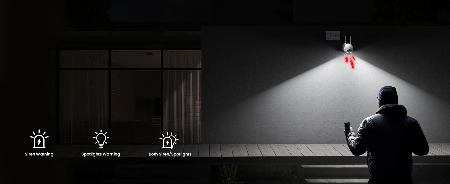The new alarm system automatically/manually turns on the floodlights/siren to protect your property.