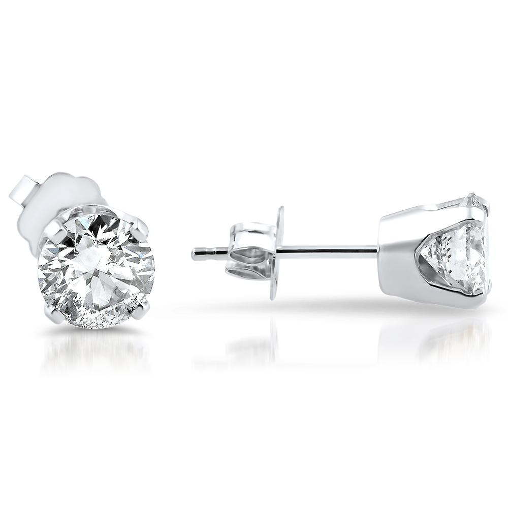This pair of round brilliant cut enhanced diamonds are securely prong set in a 14k white gold basket mount. Both earrings include push backs for comfortable wear.