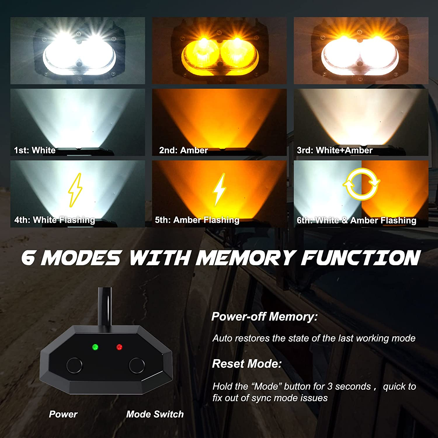 6 main LED chips in the middle provide white/amber dual color light and flashing strobe function (6 flash modes with Memory Function).