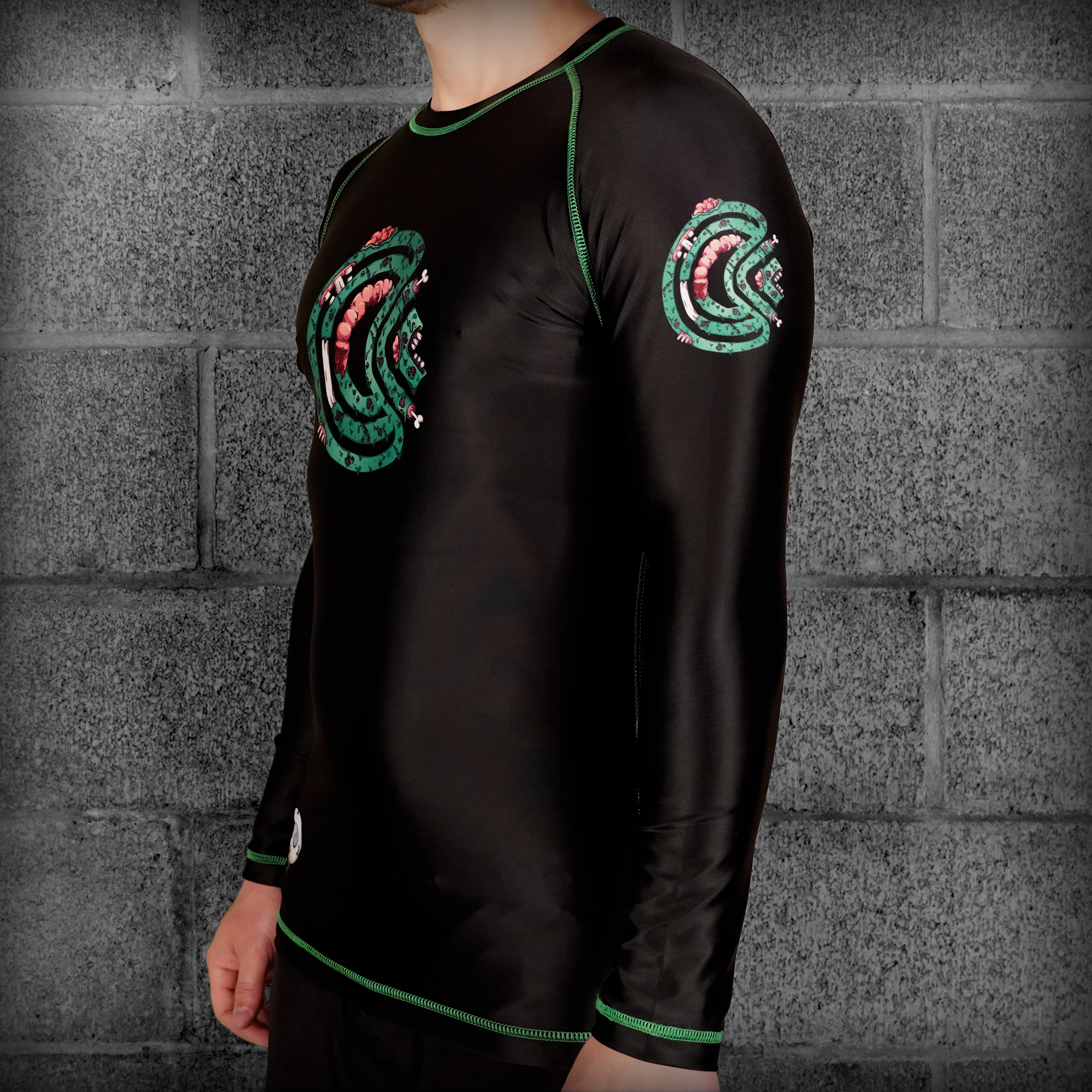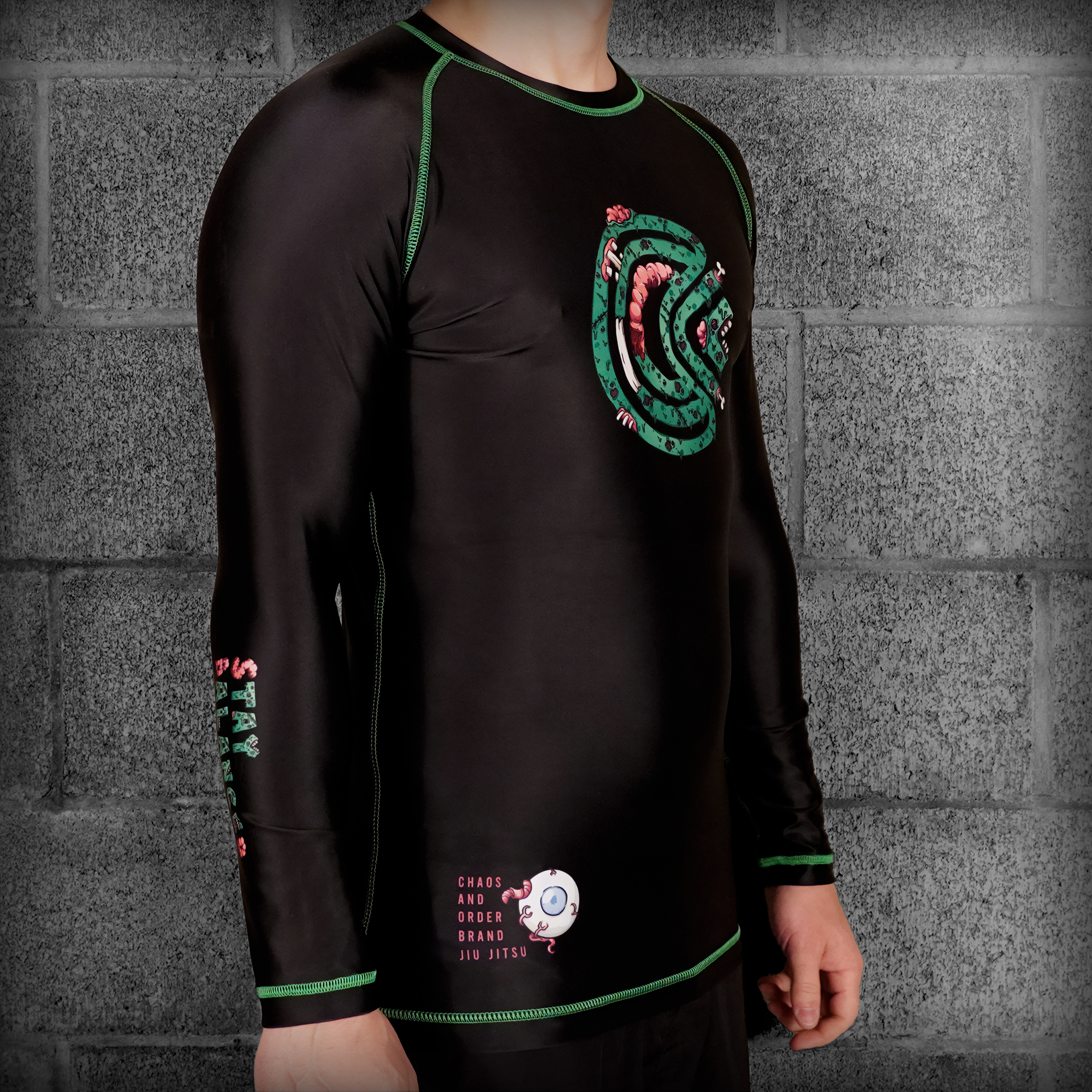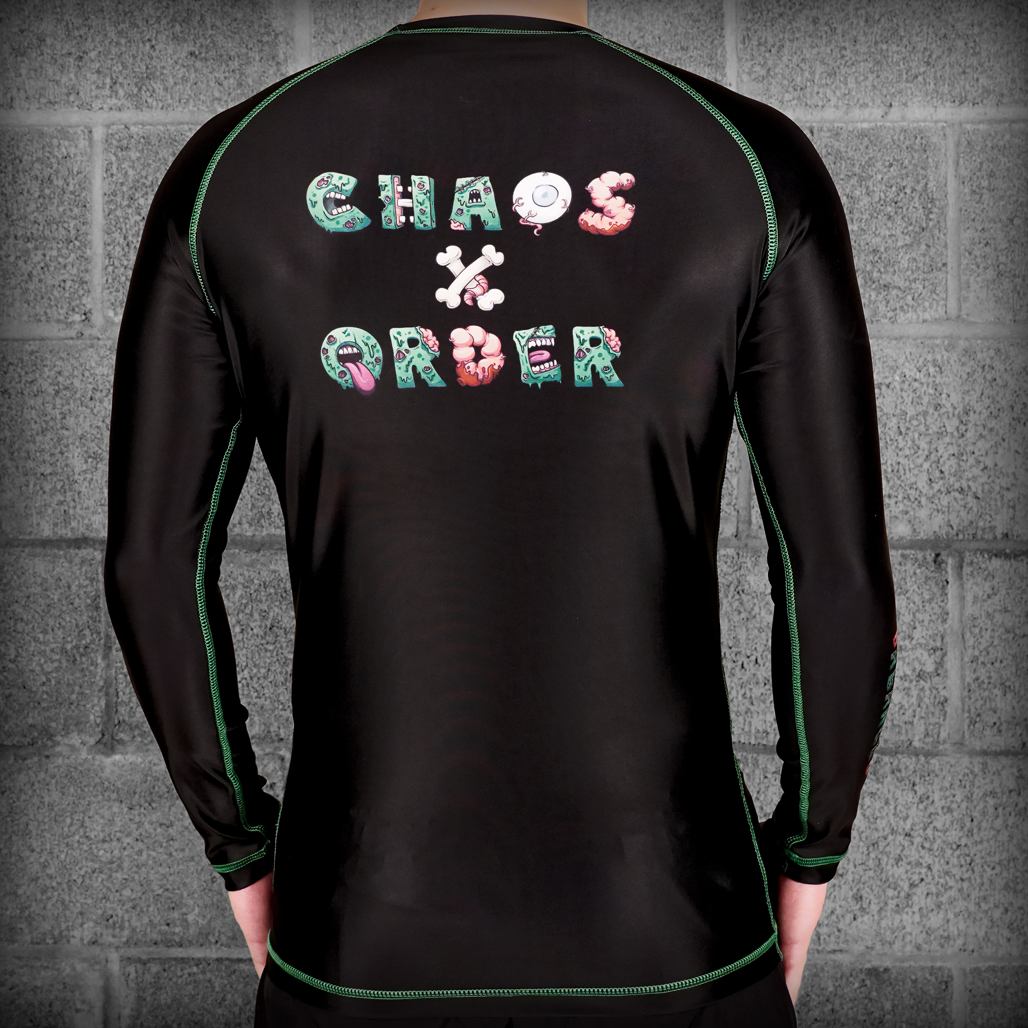 The Chaos and Order Zombie Long Sleeve BJJ Rashguard features fully sublimated designs so colors will not fade. This rashguard is made from a high quality polyester/spandex blend and features extremely durable flatlock stitching.
