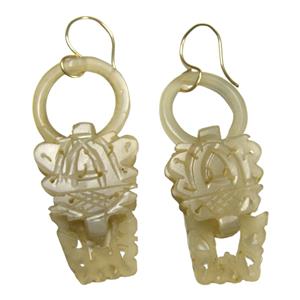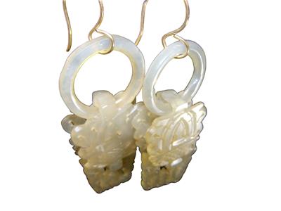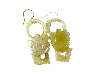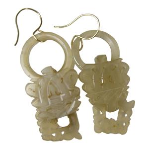 Antique Chinese Export Carved Mutton Fat Jade Dangle Devil's Work Wedding Earrings, Gold French Wire Closure. Each Earring carved from one piece of Jade.