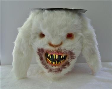 Scare the daylights out of everyone with this gruesome rabid bunny mask. This terrifying mask is made from vacuum-formed plastic, covered in white fur and features red mesh-fabric eyes, long yellow pointy teeth and mouth covered in the blood of his previous victim. Mask is held in place by an elastic strap that goes around the back of the head. Kids will never look at the Easter bunny the same again.