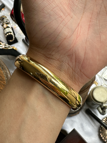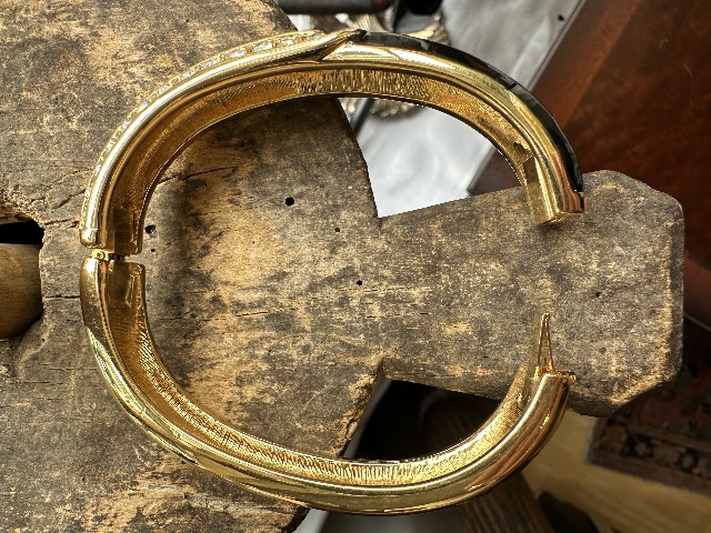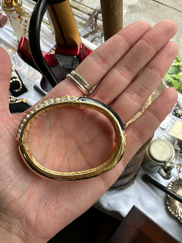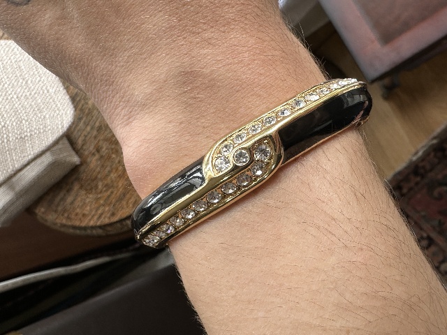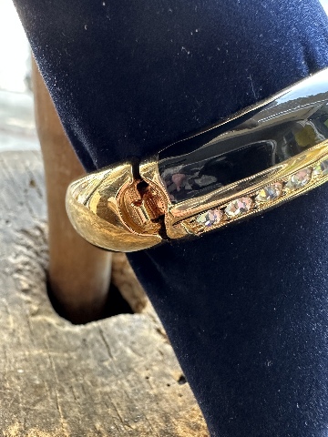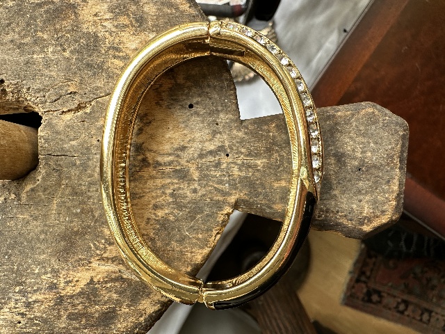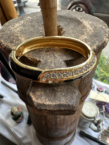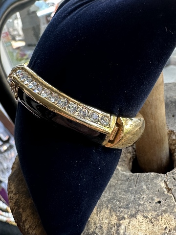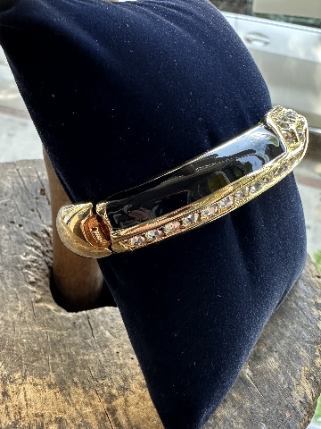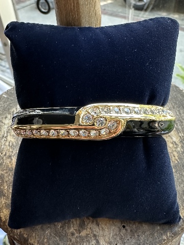 Item here is a vintage Swarovski gold plated hinged bangle bracelet with a pave stone design and black enamel. This bracelet is marked with the Swarovski stamp and closes with a push/tab insert clasp. This bracelet is in stunning condition and waiting for its new owner!