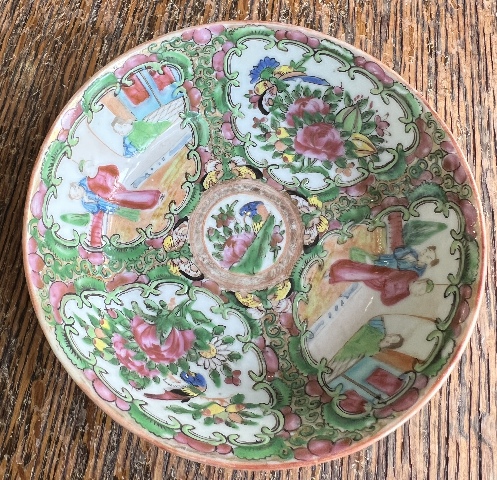 We are offering an antique Chinese porcelain bowl, measuring about 1.25” high and 4.75” in diameter. This piece is from the Qing dynasty in the 18th century, painted in the rose medallion pattern with a famille rose glaze. The outside and bottom of the bowl are unpainted and unmarked, which is expected of a piece of this age. This piece is the perfect addition to any collection.