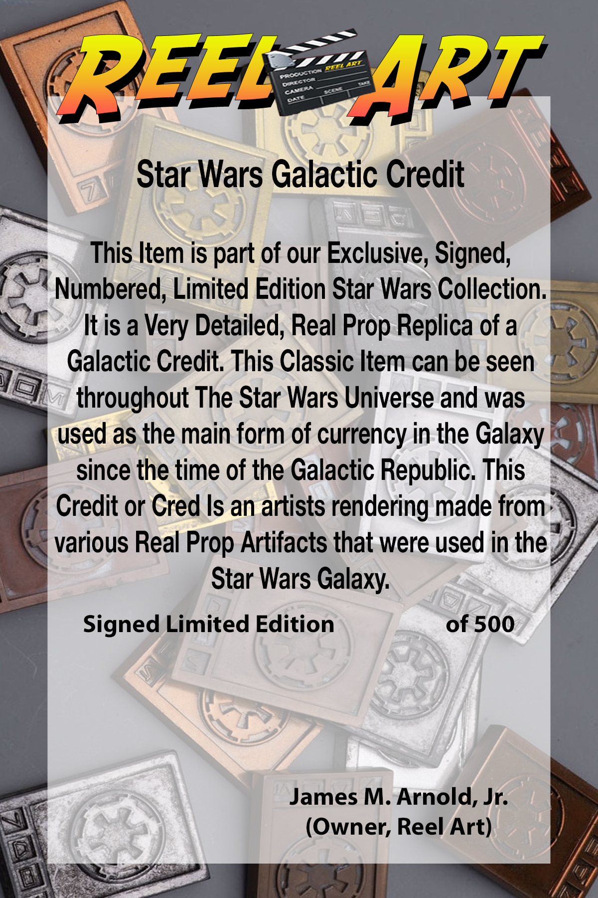 This Galactic Credit Ingot and Chip, Three Color (Gold, Silver, Bronze) Twelve Piece Set is part of our Exclusive, Signed, Numbered, Limited Edition Star Wars Collection. This Credit Set is a Very Detailed Real Prop Replica Artists Rendering made from Real Prop Artifacts that were used in the Star Wars Galaxy. Each item comes complete with a Double Sided, 4 x 6 inch, Full Color, Professionally Printed, Certification Card that is signed by the Artist. This Documentation contains Poster Art and Explains in Detail about Galactic Credits and how they were used in the Galaxy. Each Item comes in a Black Velvet Bag.