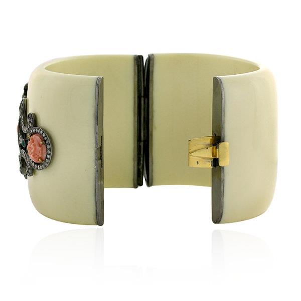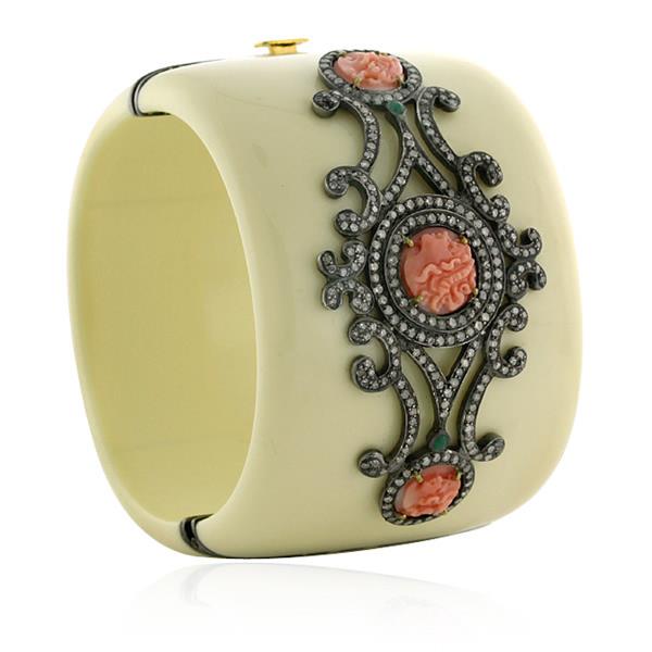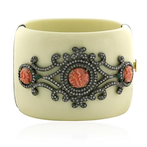 378,20 ct Bakelit geschnitzter Korallen-Smaragd-Diamant-oxidierter Armreif aus 925er Silber