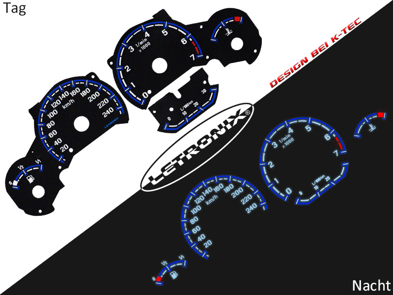 Mit unseren selbstleuchtenden Letronix Plasma Tachoscheiben im schwarzen Design (Design by K-Tec), verleihen Sie Ihrem Tacho eine individuelle und exklusive Optik. Die Tachoscheiben werden einfach gegen Ihre originalen Tachoscheiben ausgetauscht und der beiliegende Inverter wird dann an Plus und Minus angeschlossen.