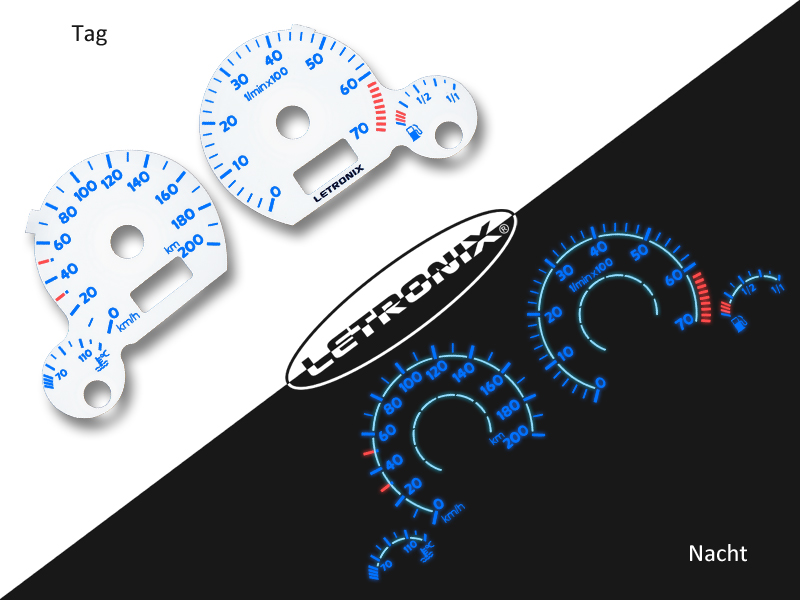 Mit unseren selbstleuchtenden Plasma Tachoscheiben der Marke Letronix, verleihen Sie Ihrem Tacho eine individuelle und exklusive Optik. Die Tachoscheiben werden 1 zu 1 gegen Ihre originalen Tachoscheiben ausgetauscht und der beiliegende Inverter wird einfach an Plus und Minus angeschlossen.