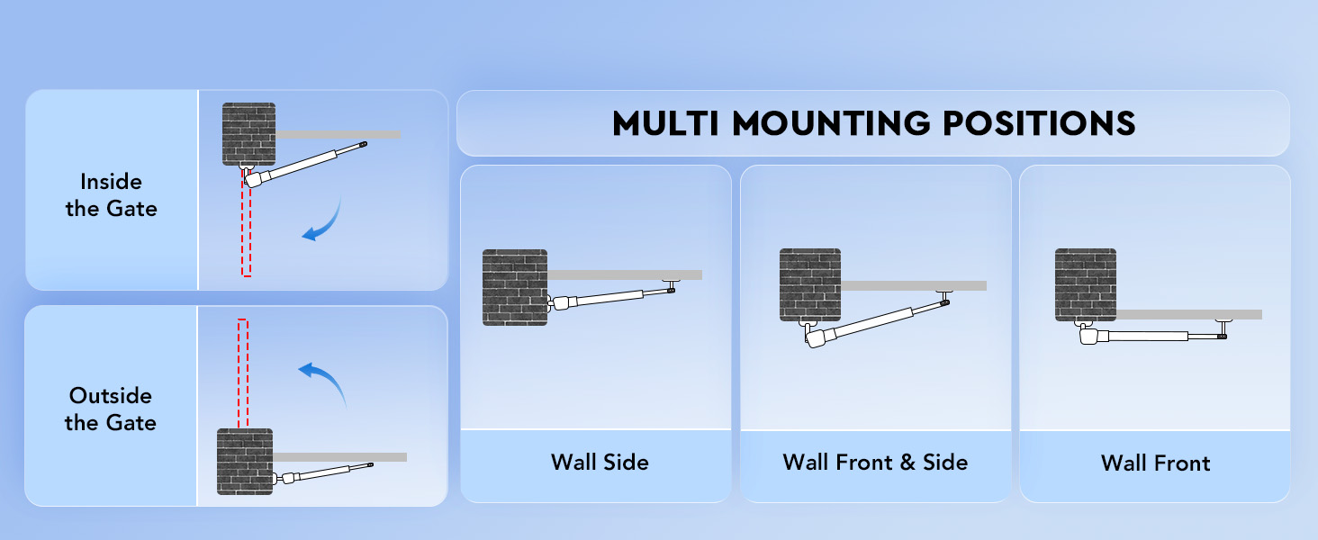 Multi Gate Control & Mounting Options: These electric gate openers come with 2 remotes but support up to 32, along with HomeLink, Bluetooth, and Wi-Fi functionality (interfaces reserved) for ease of use. They securely mount inside or outside your gate or at various sides of the gate column.