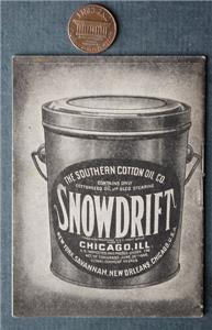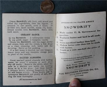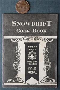 Check it out...Here's a unique, very uncommon 3" wide by 4" tall multi-paged leaflet / brochure / booklet from the Snowdrift Food Shortening Company / Southern Cotton Oil Company of Chicago, Illinois / New York / Savannah / New Orleans back in 1909-Titled "Snow Drift Cook Book. Award Ribbon Jamestown Exposition Gold Medal" on front & features lots of info & recipes inside-How cool is that? This is an ORIGINAL 100% authentic VINTAGE item-NOT a preprint or copied item and certainly NOT A REPRODUCTION item! In used condition with usual edge & corner wear consistent with age and normal use-How many of these throwaway items survived? Postage information is listed at the bottom-$ 4.95 postage is required.