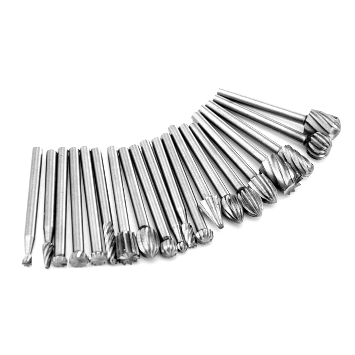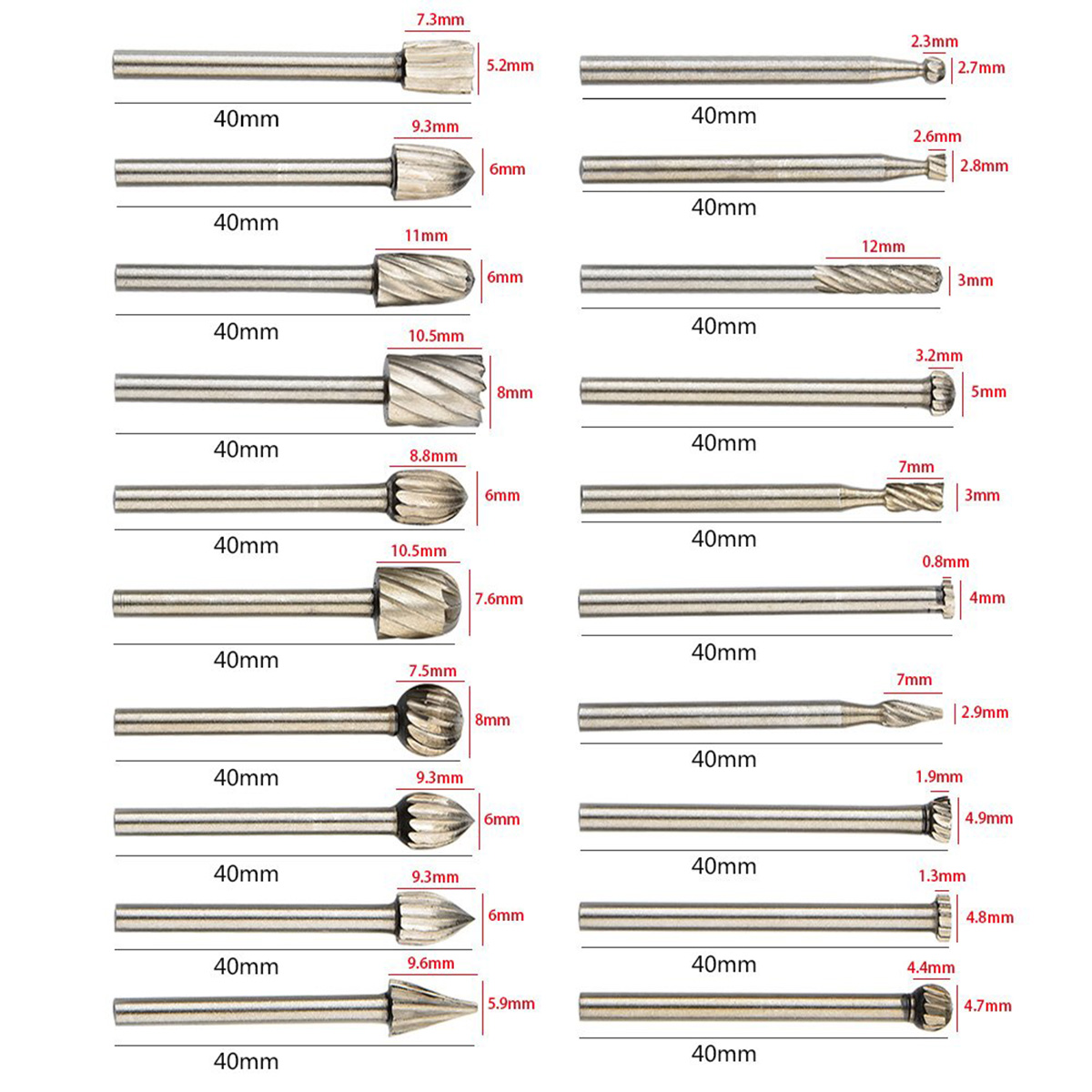 20pcs high speed steel carbide rotary burr in Assorted shape, fits Dremel Tool can meet most of your needs, for drilling holes, engraving, carving, wood working.