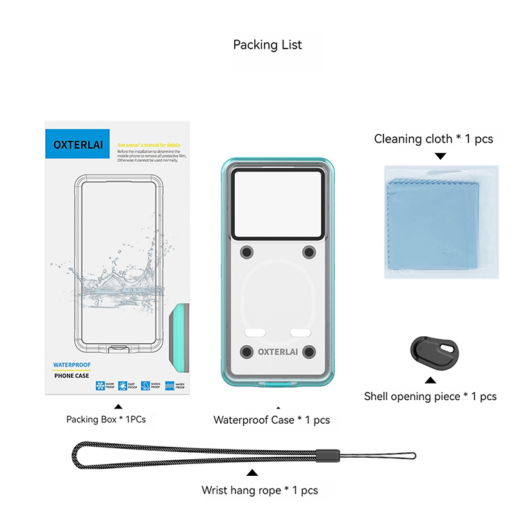 l 1x Waterproof Case+1x Shell Opening Piece+1x Cleaning Cloth+1x Wrist Hang Rope