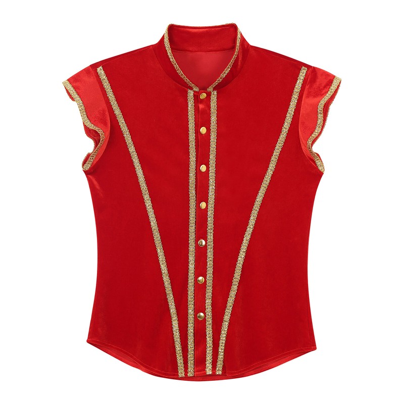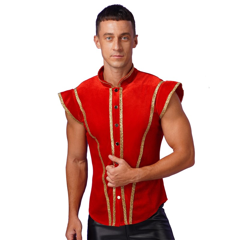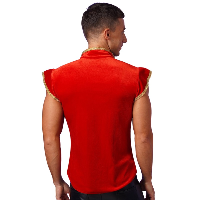 Men’s medieval velvet top designs with stand collar, fly sleeve, pressing button up and trims with glitter gold details.