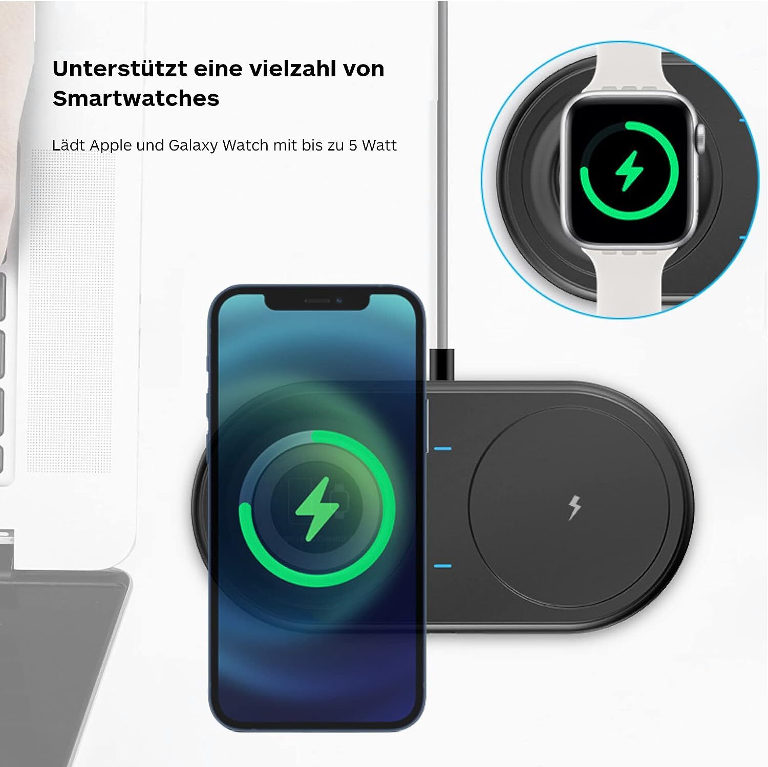 Vielseitige Kompatibilität: Dieses Ladepad ist äußerst vielseitig und kompatibel mit einer breiten Palette von Geräten. Es funktioniert mit den neuesten iPhone-Modellen (14, 13, 12, 11Pro Max, SE, X, XS, 8), Apple Airpods 3/2, Apple Watch, Samsung Galaxy 22, Note, und vielen anderen Galaxy Watch Modellen sowie Geräten anderer Hersteller. Es ist wirklich ein Allrounder, der nahezu alle Geräte kabellos mit neuer Energie versorgt.