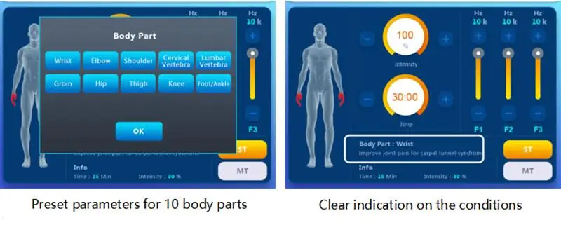 Preset 10 treatment site parameters, click the screen to select the treatment site, each treatment site has recommended treatment parameters