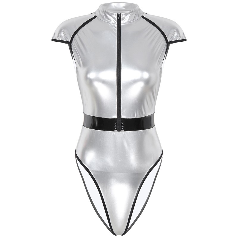 Women Shiny Patent Leather Saucer Man Cosplay Costume Bodysuit Catsuit Halloween