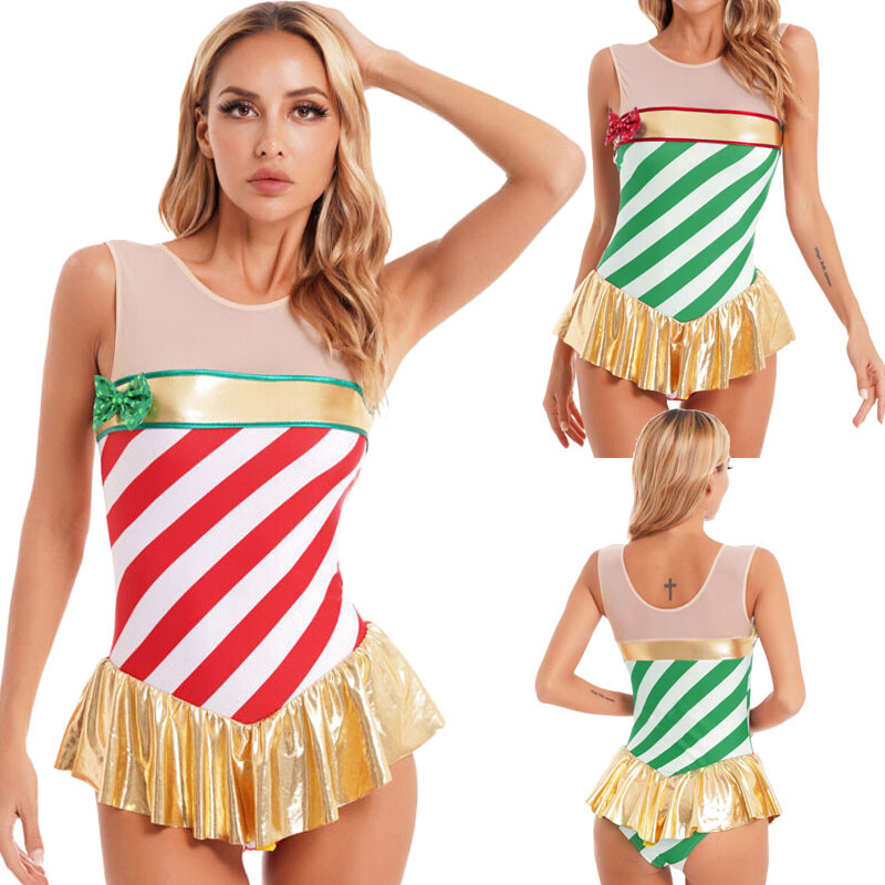 Women Feather Trimming Striped Christmas Outfit Lace-up Unlined Wireless Bra with Skirt.
