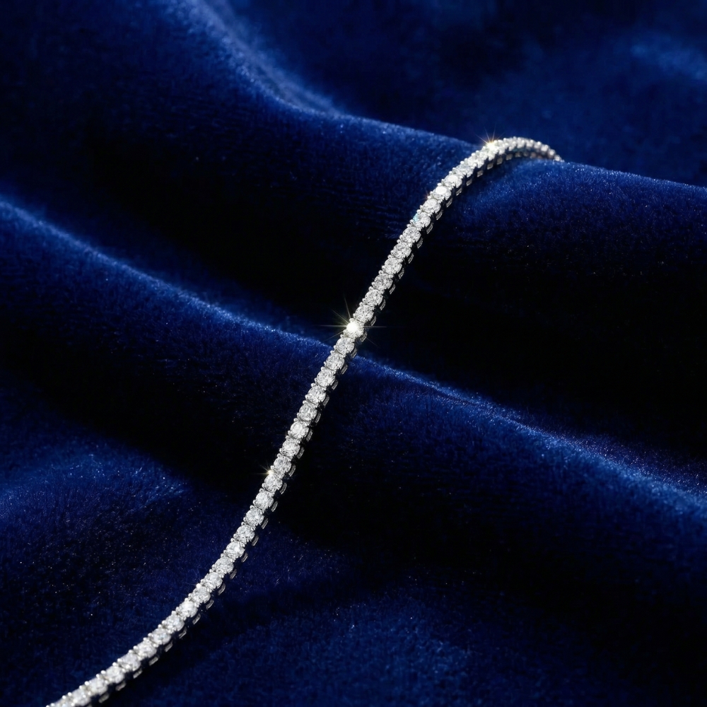 This classic style tennis bracelet features round brilliant cut lab grown diamonds. All diamonds are prong set in 14k white gold. The bracelet is secured by a double lock. 3ct total diamond weight. Measure a standard 7 inch length.