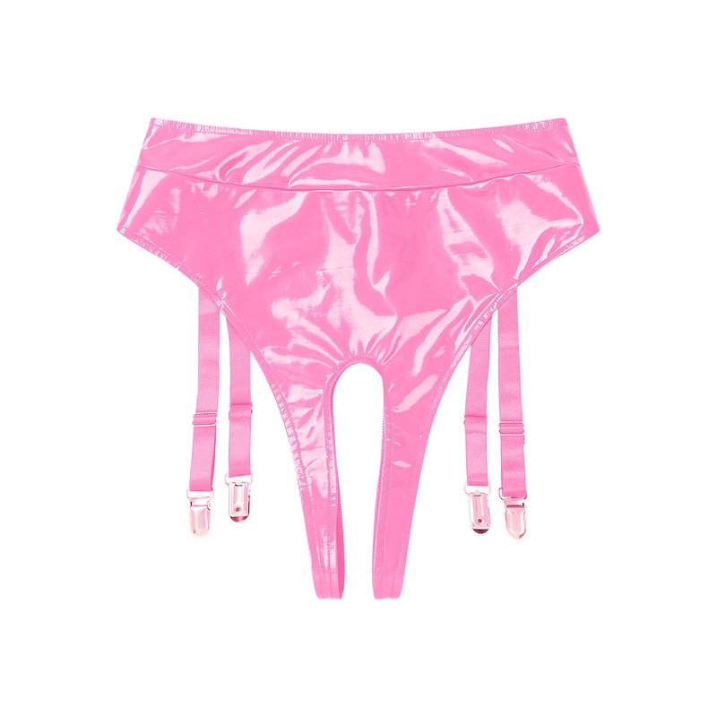 Matching high-waist and open crotch underwear, garter with clips for holding stockings.