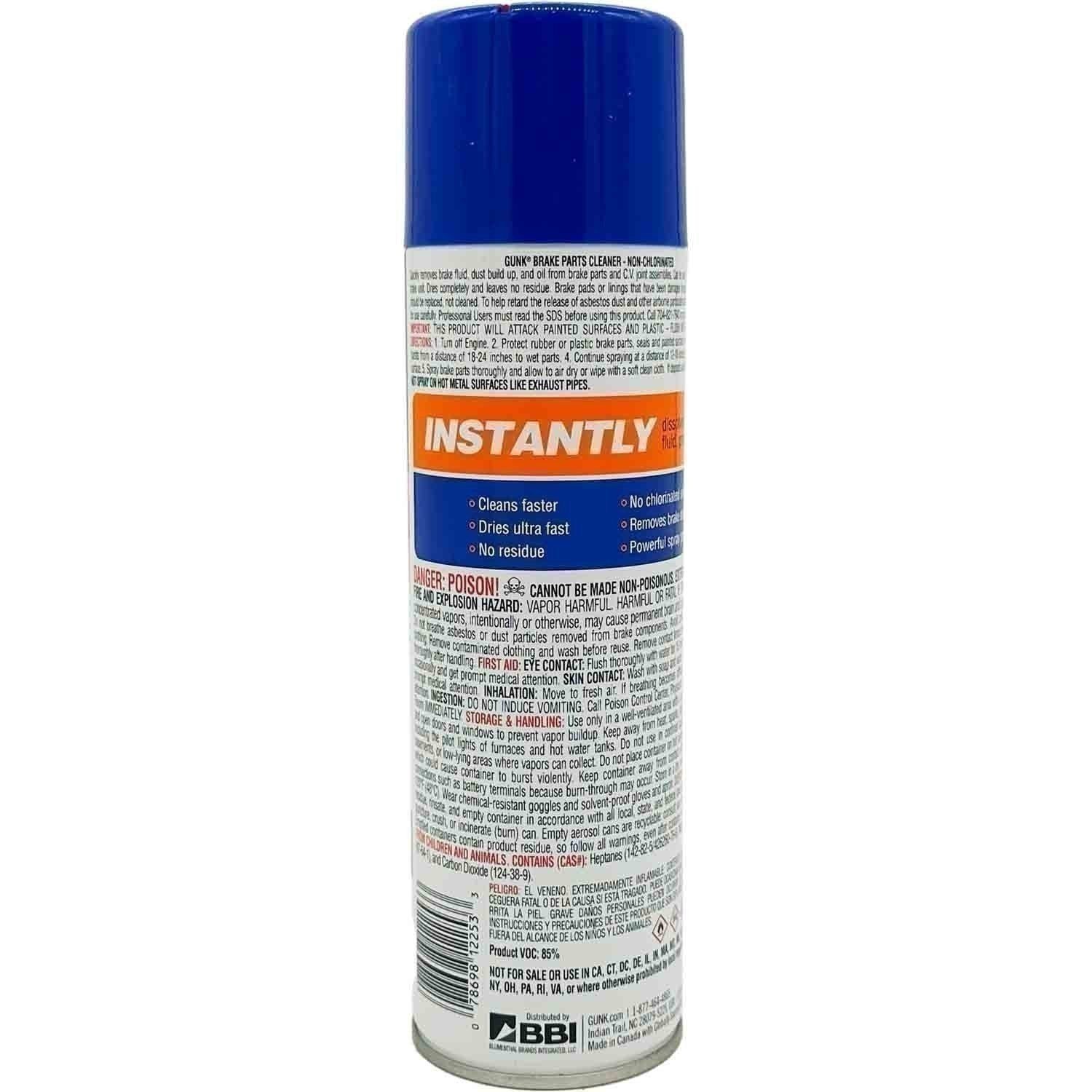 GUNK brake parts cleaner quickly removes brake fluid, dust build up and oil from brake parts and C.V. joint assemblies. Can be used without disassembling the brake unit. Dries completely and leaves no residue. Helps retard the release of asbestos dust and other airborne particulate matter. Brake pads and/or linings that have been damaged (impregnated) with oil or grease should be replaced, not cleaned. This 12 pack of brake parts cleaner will keep you stocked for when you need it.