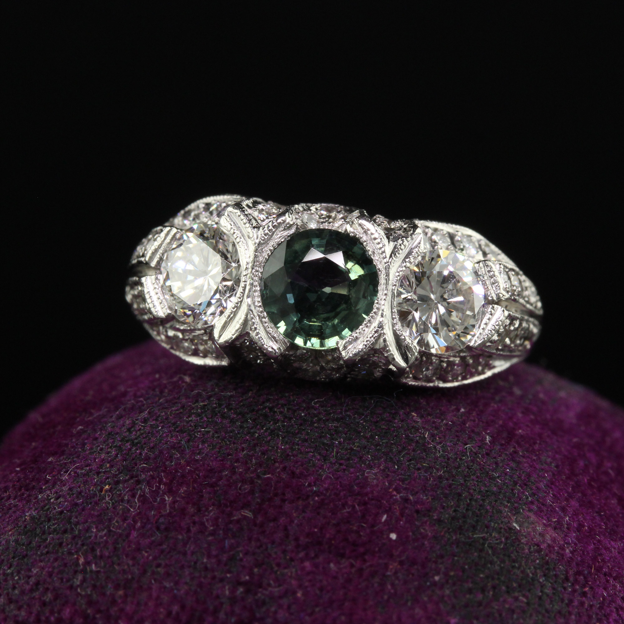 Beautiful Vintage Estate Retro Platinum Diamond and Green Sapphire Three Stone Ring. This beautiful retro three stone ring is crafted in platinum. The top of the ring has two transitional cut diamonds and a natural green sapphire center. The sides and gallery of the ring have diamonds set along a geometric pattern. The ring is in great condition and has a very impressive look.