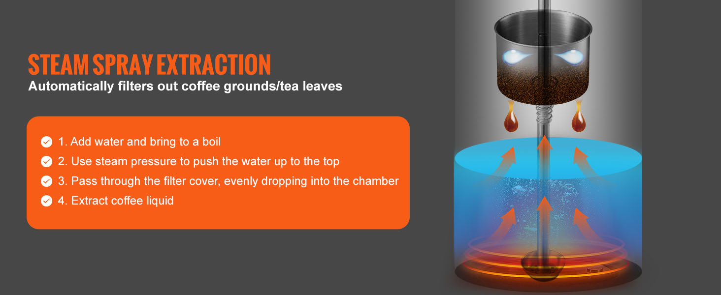 This electric coffee percolator features a durable stainless steel filter and piston tube, designed for effortless cleaning and eliminating the need for disposable paper filters.
