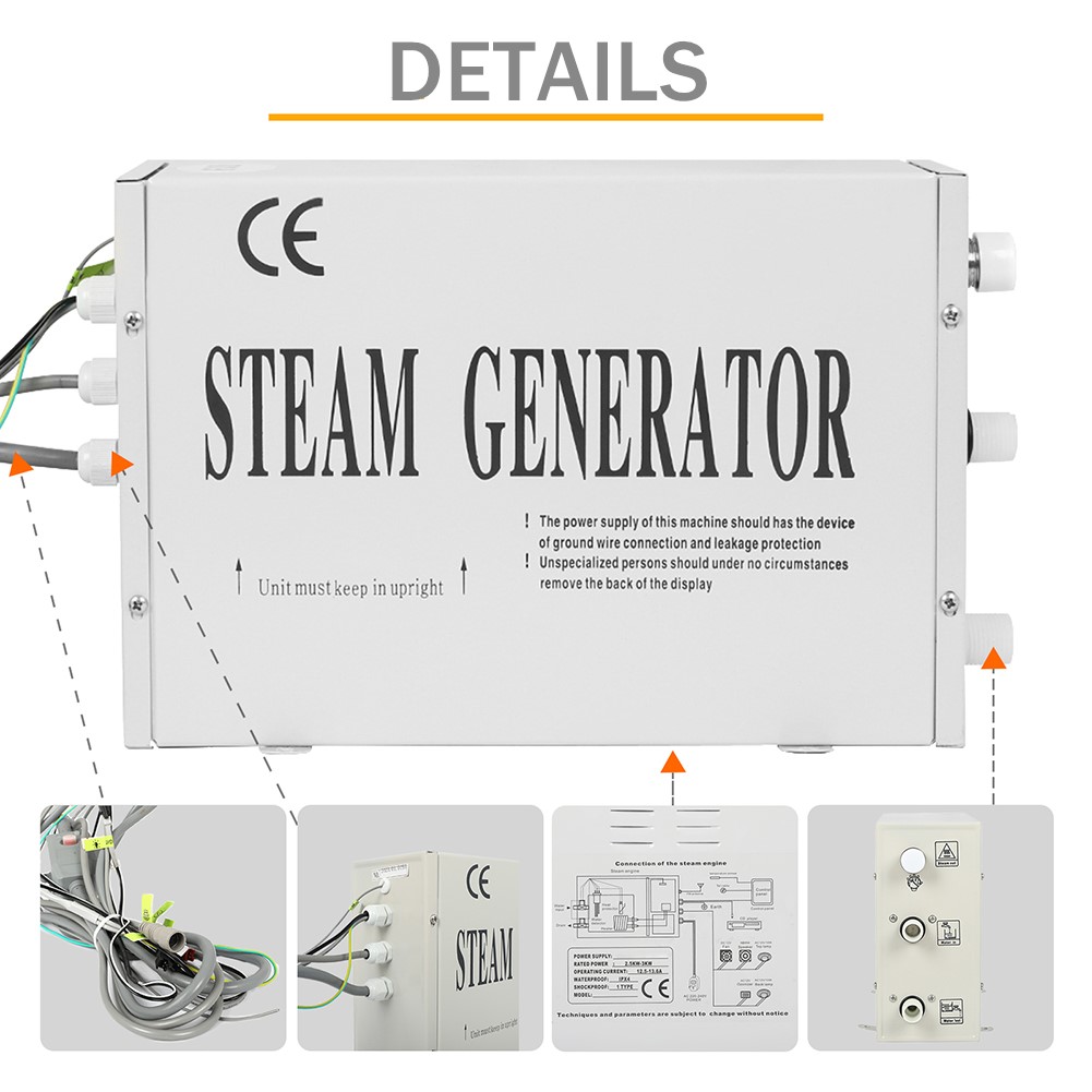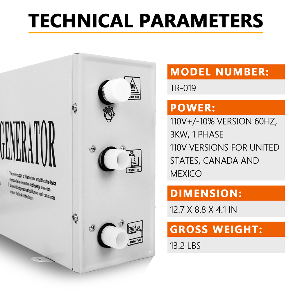 You could enjoy a comfortable home SPA atmosphere brought by this 3kW steam generator. It not only brings you a relaxing and pleasing experience, but also makes you healthier. And you will get the whole system including steam generator, connectors, the multi--functional TR-019 digital controller and all of extra following parts: