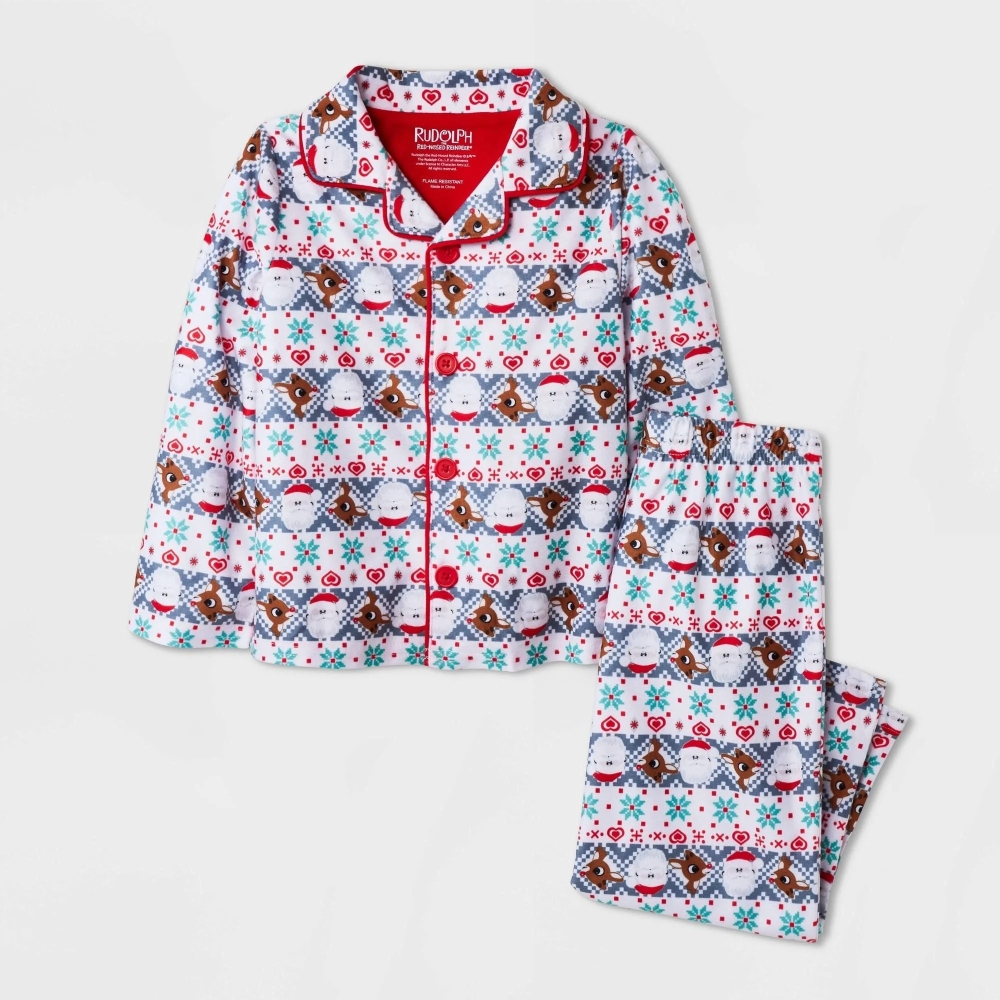 Features a fair isle print of Rudolph and Santa with hearts and holly leaves throughout.