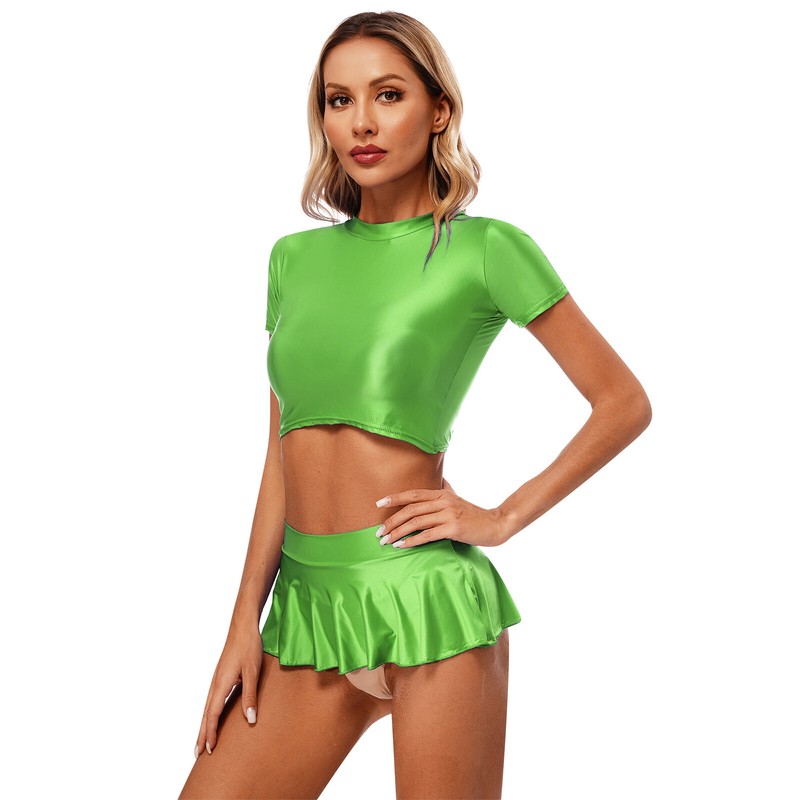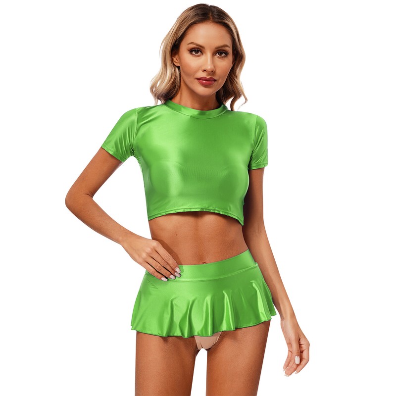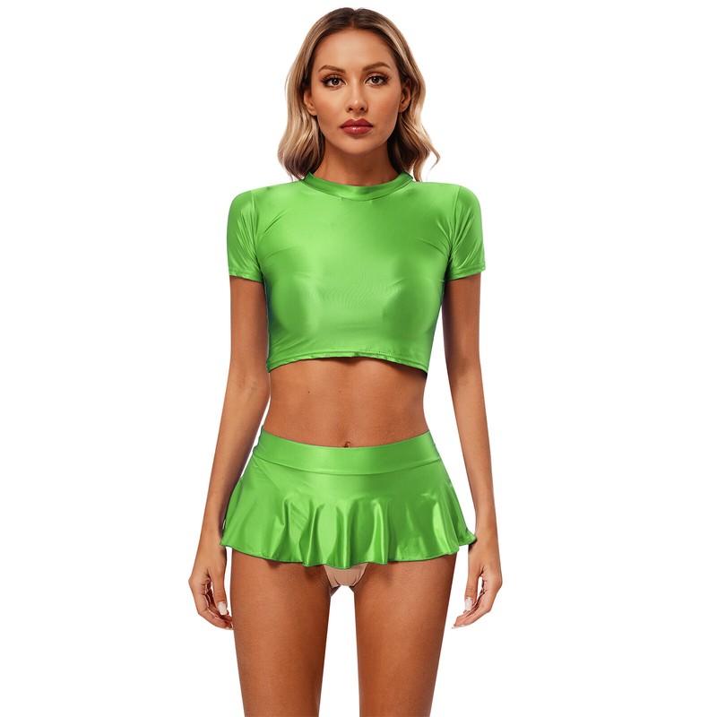 Womens Crop Top And Skirt Dance Swimsuit Stretchy Outfits Glossy Bikini Set