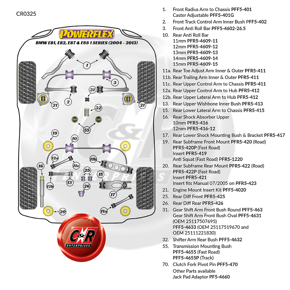 Um die richtige(n) Powerflex-Buchse(n) zu identifizieren, die Sie benötigen, sehen Sie sich bitte das Positionsdiagramm weiter unten in der Auflistung an.