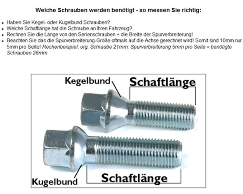 Dies ist abhängig, welche Alufelge am Fahrzeug verbaut ist! Es unterscheiden sich die Schrauben in Länge und ob Kugel- oder Kegelbund. Bitte beachten Sie unsere Abbildung Bild 6, wie man Schrauben unterscheiden kann.