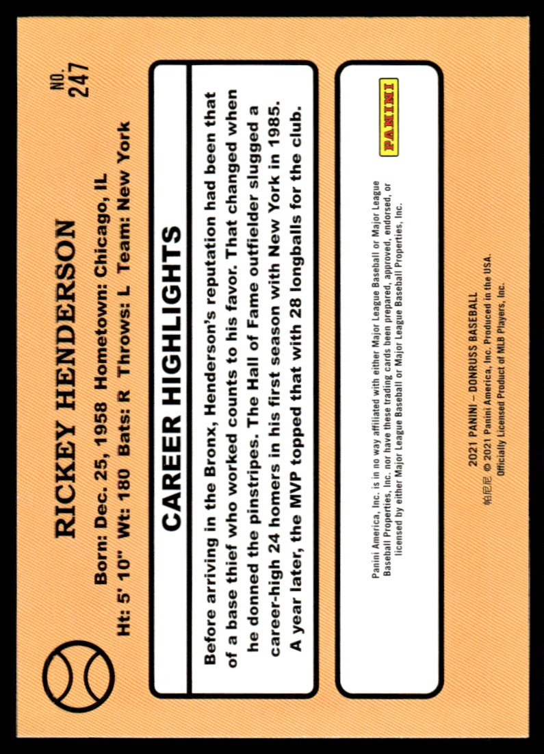 | 2021 Donruss Rickey Henderson New York Yankees #247 | ||||||||||||||||