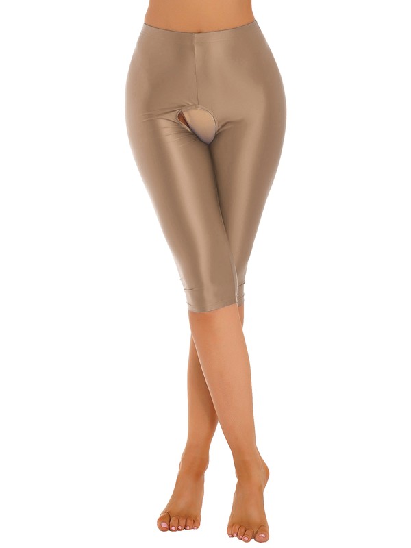 US Women High Rise Shiny Tight Shorts Workout Yoga Sport Knee Length Short Pants
